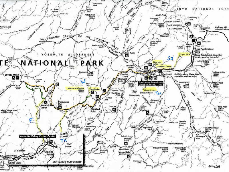 After breakfast, most of us carpooled to the trailhead at the Yosemite Creek Campground (7,204’). The final four miles were on a dirt track leading through the forest, along which we stopped and took photos of a large meadow that was bursting with wildflowers. The trail followed beautiful Yosemite Creek downstream mostly through forest for six miles to the top of Yosemite Falls (6,526’) where we enjoyed the view of Yosemite Valley and rested a while. We then descended the trail beside the falls to the floor of Yosemite Valley (4,000’) and hurried over to the Yosemite Valley Visitor Center to catch the 5:00 p.m. YARTS bus back to Tuolumne Meadows [we’d have been stuck in the Valley if we’d missed it], having completed a 10-mile hike with about 400’ of elevation gain and about 3,400’ of elevation loss. NOTE: Three Trailblazers (Cliff, Gary, and Roger) began hiking earlier than the main group. They completed a strenuous round-trip hike of about 19 miles with an elevation gain (and loss) of nearly 4,000’ (from the Yosemite Creek Campground to Yosemite Falls to the floor of Yosemite Valley and back). Some of the other Trailblazers spent the day in Yosemite Valley shopping and sightseeing; three of them saw a black bear and two bear cubs in the Valley.