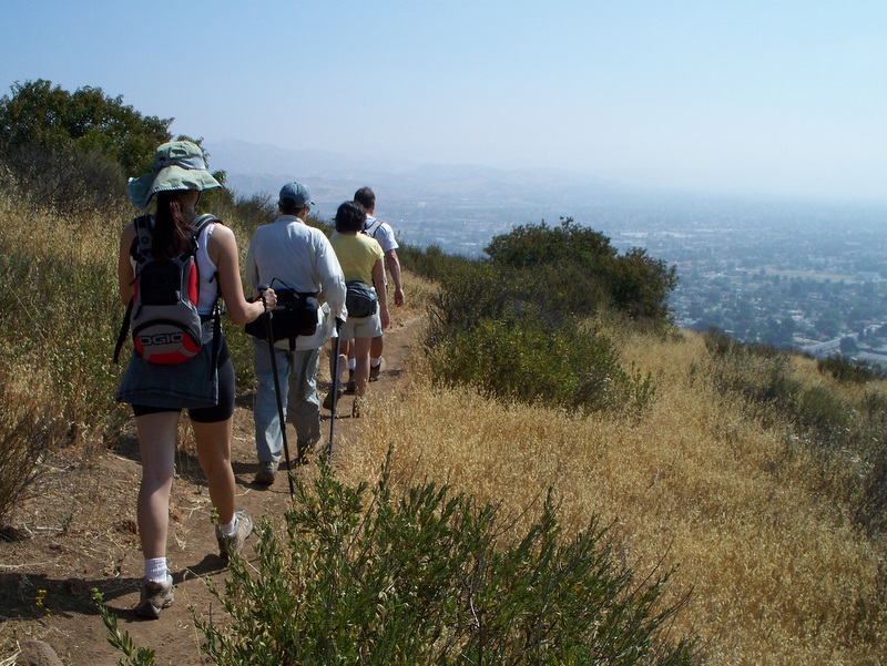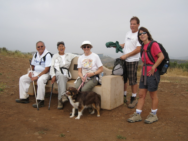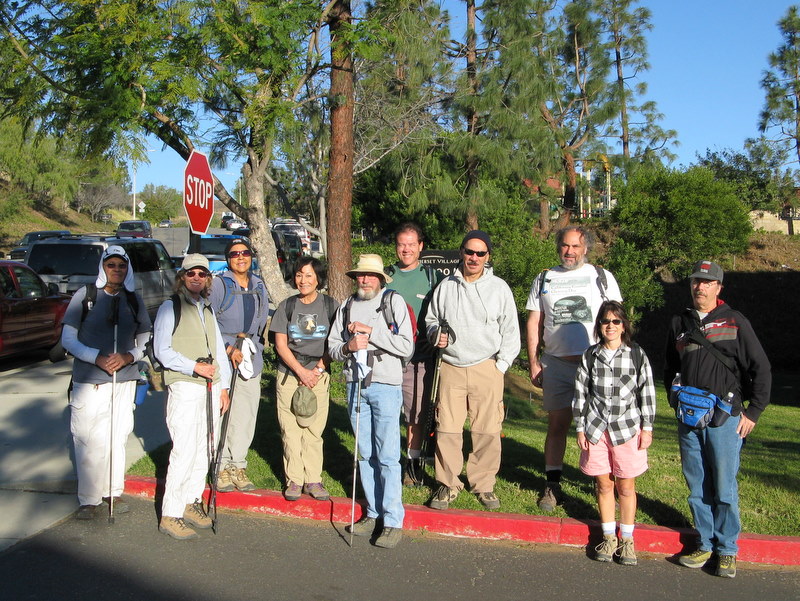 16 hikers (+ Heidi, a cute dog) met in the Long Canyon Trail parking lot (1,103‘) near the junction of Wood Ranch Parkway and Long Canyon Road on a relatively cool morning. After brief introductions and a reminder of certain hiking etiquette, the hike began by climbing the moderately strenuous Long Canyon Trail to a ridge east of Simi Valley; along the way there were good views of the west end of Simi Valley and beyond, including the Bard Reservoir. Soon thereafter two of the hikers turned back, having already gotten a pretty good workout. The rest of the group continued eastward along a fire/ranch road to a partially shaded trail that led southward down to the Albertson Motorway, a wide, nicely graded dirt fire road that is roughly parallel to Hwy 118. We followed the motorway as it climbed steadily to the east, eventually reaching a junction with the primary north-south trail that runs through China Flat (~2,050’), a lovely grassy meadow that is dotted with oak trees. Two additional hikers in our group decided to turn back at this point. We followed a winding trail (the China Flat Loop Trail) to the south and west until its junction (2,148’) with the Simi Peak Trail. We then began the final ascent along the fairly well-maintained trail to Simi Peak (2,403‘), the highest point in the Simi Hills (which occupy the area between Simi Valley and Hwy 101 and between Hwy 23 and the San Fernando Valley). We rested atop the peak and enjoyed the panoramic view, including looking down at Oak Park to the south; the hikers who arrived at the peak first spotted a deer that bounded away through the brush. After a while we returned to the Long Canyon Trail parking lot, deviating slightly from our earlier route. The day had warmed up noticeably by that time so the climb from the Albertson Motorway to the ridge just east of Simi Valley was noticeably harder than our uphill efforts earlier in the day. Reaching the parking lot, we had completed a 10-mile hike with 1,911’ of elevation gain.