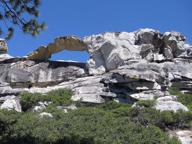 After breakfast, we carpooled to the Porcupine Creek parking lot (8,100’) to begin our hike to North Dome (7,542’) across Yosemite Valley from Half Dome. The trail immediately descended through a forest of lodgepole pines and red firs, crossing a pretty creek, and continuing on to a junction with an out-and-back trail to Indian Rock Arch. Most of us hiked the 0.3 mile up to the 15-foot natural granite arch (a very unusual formation in this area) and were rewarded by a bird’s-eye view of the area. Returning to the main trail, we continued hiking southward toward Yosemite Valley, and soon could see our final destination in the distance. At the next trail junction we took the left fork and descended through a small forest to a saddle, and then hiked up the northwest side of North Dome (a huge granite monolith). Atop the dome we had an incredible close-up view of Half Dome and an unsurpassed view of Clouds Rest, as well as spectacular views of the Yosemite Valley floor and Illilouette Fall. After an extended break for photographs, rest, and just enjoying the beauty of the spot, we began the return hike. Since the afternoon had warmed up quite a bit and the return trip was generally uphill, many of us were happy to get back to the parking area, despite the beauty of the trail, having completed a 9.4-mile hike with about 1,000’ of elevation gain. We returned to the campground, stopping again at the store/grill on the way.