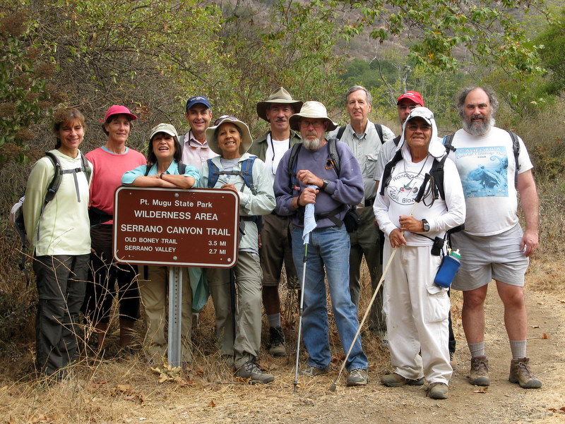 Eleven hikers met at the Madera Road carpool point on a slightly chilly morning. They then drove to the Big Sycamore Campground parking lot in Point Mugu State Park (the entrance fee is now $12; $11 if a “senior” is driving). The hike began by our walking north on Sycamore Canyon Road which is paved in the campground, but soon becomes a dirt road. After walking a little over a mile on the dirt road, we reached the trailhead for Serrano Canyon on the right. Our hike immediately improved dramatically as the trail [not a dirt road] headed eastward upstream for 1.7 miles through the shady wooded canyon which was pretty despite the prolonged absence of rainfall. We emerged from the canyon into lovely Serrano Valley which is ringed on all sides by mountains; it consists mainly of large meadows covered by wild grasses and dotted with a few trees and some bushes along the seasonal streams. There we began hiking the Serrano Valley Loop in a clockwise direction, stopping briefly to examine ranch artifacts such as an old water pump, an old abandoned car frame, and an old horse watering trough. The west side of the loop climbed part way up the mountain to a fork in the trail. We took the fork to the right and followed the trail as it climbed into the foothills along the north side of the loop [the left fork would have taken us to the Old Boney Trail]; it provided great views of the towering mountains to the northeast. Soon the trail began descending along the east side of the loop affording us with excellent views of the western part of Serrano Valley and the mountains to the south. We completed the 2.6-mile loop, rested briefly, and then descended through pleasantly cool Serrano Canyon to Big Sycamore Canyon where there were surprisingly few bicycle riders and virtually no other hikers. After a brief lunch break, we returned downstream to the campground parking lot, said our goodbyes to our friends, and returned to Simi Valley having completed an 8.8-mile “lollipop loop” hike with 950’ of elevation gain on a good day for hiking.