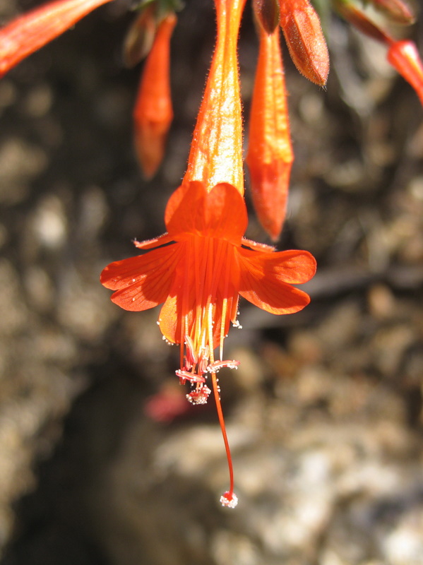 An easy trail bordered by wildflowers led to the entrance of the shaded canyon; it then led along the north side of the canyon on a shelf overlooking the creek, but the shelf narrowed until we had to descend into the dry streambed. Our trip upstream required quite a bit of boulder-hopping and some bushwhacking. We passed a tall dead ponderosa pine tree (a landmark) in the streambed; a short distance beyond the tree we reached two (perhaps three) water-sculpted pools at the base of a waterfall. We turned around and returned to the parking lot, stopping along the way to help a couple of young lads who said they were lost (and they had no water).