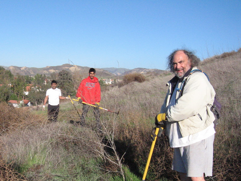 The weather was great, sunny and cool but it had rained on Friday and the clay soil stuck to our boots. At the first assent of the trail we encountered a lot of Tumbleweed crowding the trail. The large bushes were removed, pushed off-trail and stomped on so they wouldn’t blow away. There was already a lot of new grass growth on the trail and in places had to be cut away. Other work involved removing the many dried stalks of Mustard that grew alongside and were overhanging the trail. We made good progress and cleared about three quarters of the portion of the trail from the Yosemite/Flanagan trailhead to the Geronimo Ave. trailhead. The remaining quarter is mostly clear.