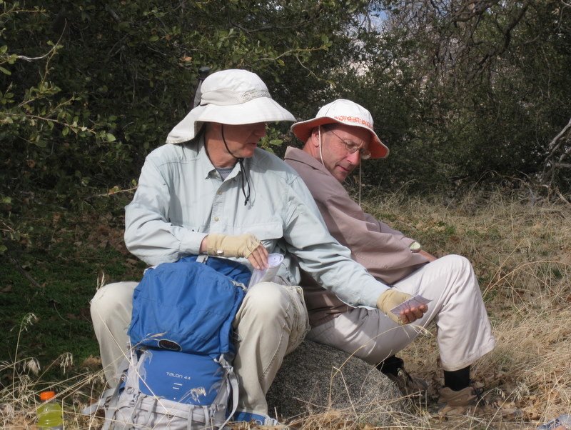 12 hikers carpooled to the Pacific Crest Trail (PCT) crossing (4,000’) on Pine Canyon Road (N2) a few miles south of Gorman, CA, stopping on the way to leave a shuttle vehicle on the Old Ridge Route Road (8N04); we were joined by a 13th hiker at the trailhead We followed the PCT as it rose gradually up Liebre Mountain through manzanitas, digger pines, and black oaks via long switchbacks; many large California buckeye shrubs had shed their chestnuts along the trail. After passing Horse Camp, the trail rose more steeply through a bigcone-Douglas-fir forest to unpaved Liebre Mountain Road (7N23) on the oak-dotted crest line (5,759’). Leaving the PCT, we headed west following an abandoned stretch of the PCT and then descended on the “Golden Eagle Trail” through a lovely forest until we again met 7N23. Somewhat disoriented, we confirmed our location and decided to descend 7N23’s long switchbacks to 8N04. We were aided in our descent by hitching rides from a couple of passersby, retrieved our shuttle vehicle, and eventually returned home, having completed a 12.1-mile hike with 2,010’ of elevation gain. The views from Liebre Mountain were fantastic, the scenery was beautiful, and it was a perfect day for hiking.