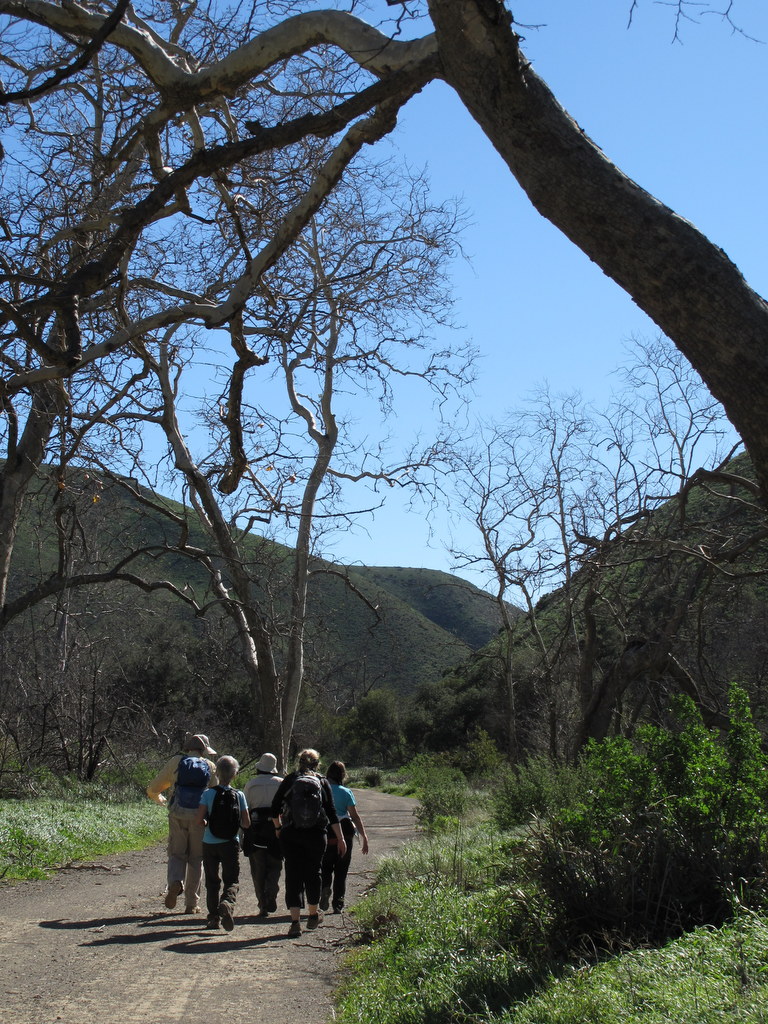 On a clear winter morning with a pleasant temperature (but with a “wind advisory”), 18 hikers carpooled to the Big Sycamore Canyon Campground (where we dropped off four shuttle vehicles) and then over to the nearby Ray Miller trailhead in La Jolla Canyon in the Santa Monica Mountains, ready to embark on the first of eight Saturday day-hikes which will cover the entire SMMNRA Backbone Trail. As the Ray Miller trail climbed via gentle switchbacks up to the Overlook Fire Road, it afforded views of several of the Channel Islands and provided some shelter from the strong winds we encountered (which also provided unusually clear views of the area). As we neared the Overlook Fire Road we were “attacked” by gale-force winds but we persevered. The mountainside was pleasantly green and a few wildflowers were blooming. The BBT then followed the fire road to the Wood Canyon Vista Trail (also part of the BBT). Along the way the hikers were treated to lushly green panoramic views of La Jolla Valley to the west and Boney Mountain, Serrano Valley, and Big Sycamore Canyon to the east. The trail then descended into Big Sycamore Canyon, passing a small number blooming flowers and blossoming bushes, until we reached the dirt road in the bottom of the canyon as the wind abated. We took a lunch/rest break at the junction, taking advantage of the availability of drinking water (from a faucet), a picnic table with benches, and a good vantage point from which to watch several bicycle riders go by on their way up and down the canyon. As we resumed our hike and headed downstream (we actually had to wade across running water twice) toward our shuttle vehicles, we were serenaded by beautiful bright green South American birds in the bare sycamore trees (the birds are not native to the area, but were released or escaped into the wild some years ago). We eventually arrived at our shuttle vehicles, completing a 9.8-mile one-way hike with 1,100’ of elevation gain, looking forward to hiking the second section of the BBT next week.