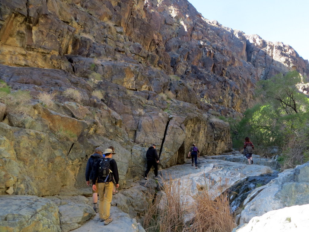 We began our hike by heading north on a well-defined trail that led to the actual mouth of Fall Canyon. The canyon “is remote and little-visited; deep and moderately narrow for many miles with occasional shaded, cave-like passageways of great beauty … smooth granitic walls [sometimes have] a bluish tint.” We hiked through the scenic canyon mostly on soft gravel until we reached a towering impassible dry waterfall. After taking some photos we returned the way we came, completing an 8.4-mile hike with 1,200’ of elevation gain/loss.