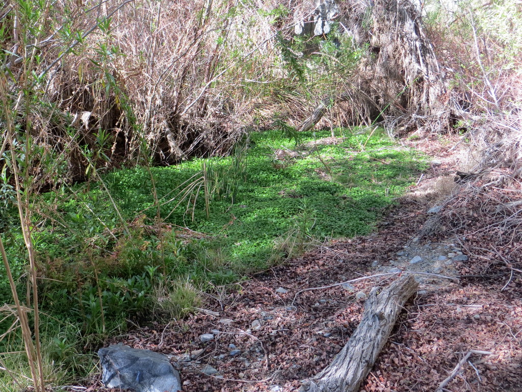 Shortly after we began our hike along the fourth section of the BBT, we began hearing the pleasant sound of rushing water, a sound seldom heard in recent years. Soon we could see the nearby stream which was swollen by recent rain. We crossed the stream on a bridge and then followed the stream up-canyon through a pleasant woodland. After trading pleasantries with a large National Park Service ranger-led group of hikers and crossing the stream on a second bridge, the trail began climbing to the east through chaparral and ceanothus. It then wound through upper Zuma Canyon, providing excellent views of a nice waterfall to the northwest, until we reached Kanan Dume Road just north of tunnel #1. After a lunch/rest stop, we followed the trail as it led uphill to the south and then eastward over the tunnel and into more woods in Newton Canyon. The erosive effects of recent downpours along most of our hike’s route were quite evident, but the scenery was beautiful as were blooming flora (such as Indian paintbrush, blooming ceanothus trees, miner’s lettuce, ferns, bright green grasses, and Indian warrior plants) and the various flowing streams lent a soothing quality to much of the hike. Eventually the trail rose to meet Latigo Canyon Road, across which we had parked our shuttle vehicles. We returned to Simi Valley having completed a 7.6-mile one-way hike with around 2,000’ of elevation gain and 1,400’ of elevation loss on yet another beautiful day for hiking.