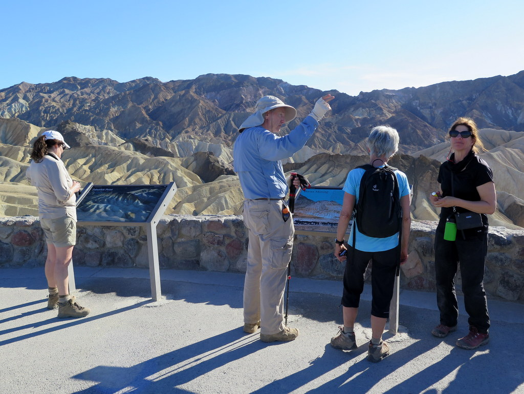 Next we undertook the long drive to Dante’s View (5,476’) via Hwy 190. Along the way we stopped at Zabriskie Point (705’) to enjoy the spectacular views available there. Dante’s View from the parking lot at the end of the access road is near the edge of the Black Mountains on the east side of Death Valley; “it gives the best overall views of the southern half of the park” looking down on the Badwater salt flats (-282’) and westward to the Panamint Mountains and snow-capped Telescope Peak (11,049’). We hiked a short distance down to another observation point, enjoyed the views, and returned to our vehicles having completed a 0.6-mile hike with 129’ of elevation gain/loss. We then returned to the Furnace Creek Campground.