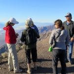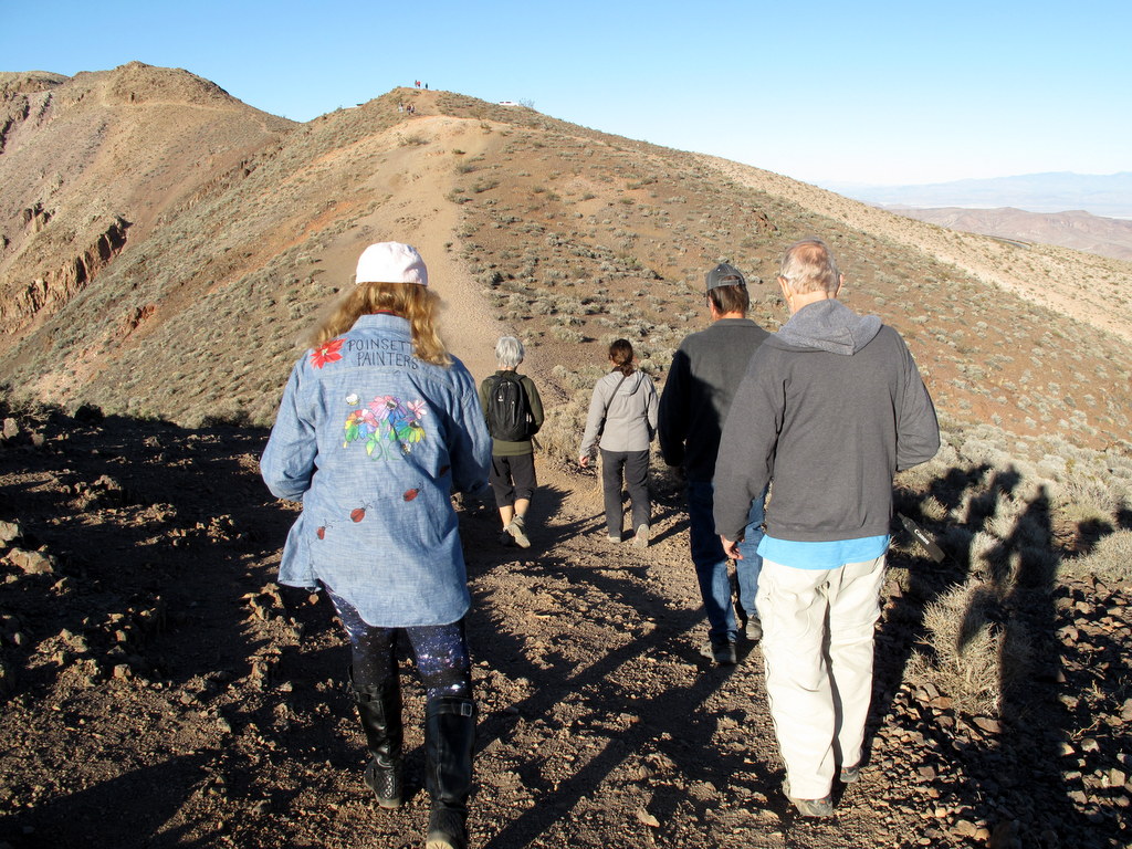 Next we headed east on Hwy 190 and then north on Scotty’s Castle Road until we eventually reached a fork in the road where we turned left and followed the access road to the Ubehebe Crater (the right fork to Scotty’s Castle was closed due to flooding in Grapevine Canyon caused by a severe thunderstorm on 10/18/2015). The Ubehebe Crater is a large volcanic crater 600’ deep and half a mile across; it was “created by steam and gas explosions when hot magma rising up from the depths reached ground water.” Three hikers descended to the bottom of the crater (thus subjecting themselves to the steep climb back up to the rim); the remaining hikers followed the trail around the rim of the crater enjoying views into the crater as well as panoramic views of the surrounding landscape including snow-capped mountains in nearly every direction (they were subjected to strong winds for a portion of their hike). The rim hikers completed a 2.2-mile hike with 750’ of elevation gain/loss.