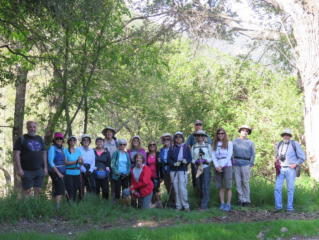 22 hikers took advantage of a nice relatively cool late spring morning to hike the unique and beautiful Fish Canyon Narrows. We began our hike at the gate at the east “end” of Templin Highway north of Castaic Lake. After taking the obligatory group photos, we began by descending northeast along the closed paved road to a concrete bridge at the mouth of Cienega Canyon [which is quite overgrown].