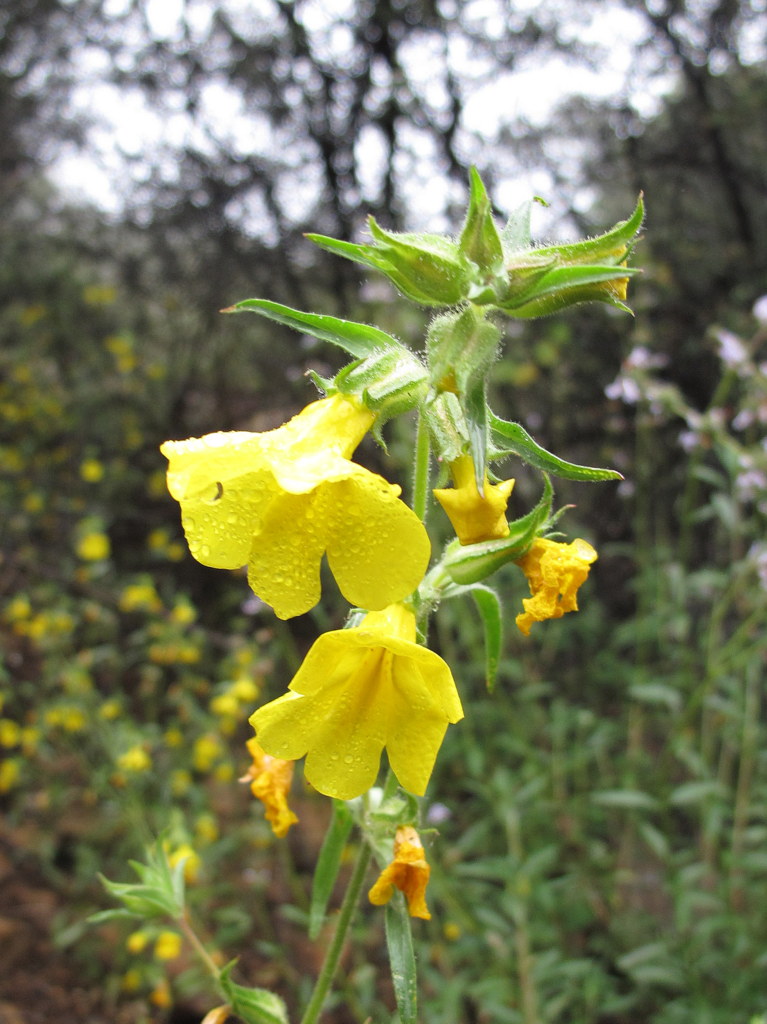 12 hikers carpooled to the Horn Canyon trailhead adjacent to the Thacher School a few miles east of downtown Ojai on a cool overcast morning. Since a very light rain was falling when we arrived at the trailhead, we donned our rain gear. As our hike began, the trail rose gradually upward to the north along a dirt road flanked by an assortment of blooming plants/wildflowers.