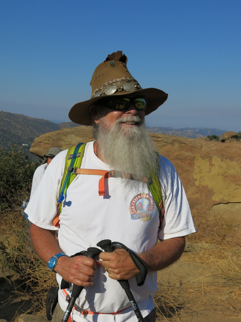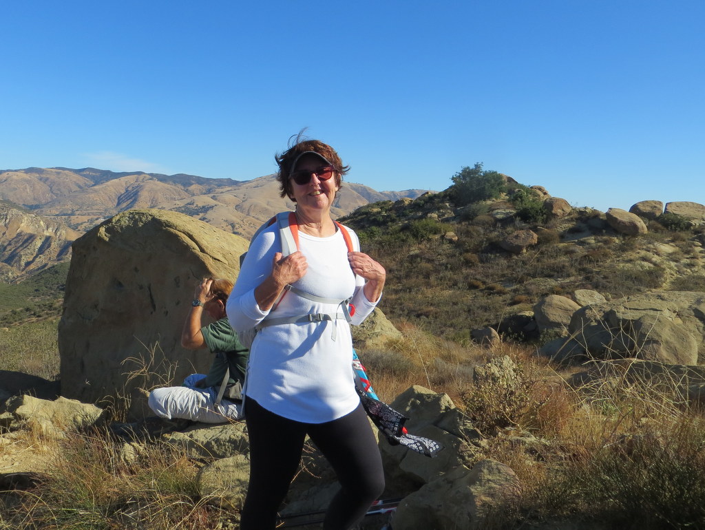 The trail passed through (and on) a variety of imposing sandstone rock formations along the way including very large boulders and giant slabs of sandstone rock, many with small “caves.” There were sweeping views of eastern Simi Valley, the Santa Susana Mountains, and the Simi Hills and even a few late-blooming wildflowers. We had the trail mostly to ourselves except for a few early morning bicyclists. NOTE: Over time bicyclists have selfishly “cut” the trail in so many places to enhance their downhill enjoyment that it is often difficult to discern the original trail. When we were over halfway up the mountain, direct sunlight finally fell upon us, but fortunately at the same time a cooling breeze sprang up and cooled us the rest of the way up to the Rocky Peak Fire Road (our turnaround point), thus allowing us to “beat the heat” all the way uphill. During a rest break at the fire road a few members of the group continued across the fire road and climbed up an extension of the trail into a maze of large boulders from which there were even better views of the surrounding area. As we retraced our route downhill, the morning temperature increased steadily until the temperature on the final (uphill) stretch of trail had reached nearly 90 degrees Fahrenheit, demonstrating the wisdom of our early start. We reached the trailhead (and our air-conditioned vehicles!) having completed a mostly pleasant 4.5-mile hike with about 1,250’ of elevation gain/loss.