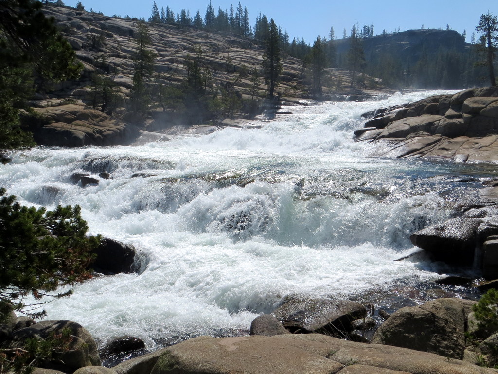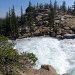 We started our hike just east of the Tuolumne Meadows Visitor Center on Hwy 120 (8,580′). After crossing the meadows on a wide gravel path (and a nice bridge), we reached Parsons Lodge and the nearby Glen Aulin Trail. The first half of the hike down to Glen Aulin was gentle and mostly shaded with occasional views of the Tuolumne River and a large gorgeous meadow. The second half of the trail was rockier and steeper (downhill) as it descended beside a series of magnificent roaring waterfalls and cascades (including Tuolumne Falls and White Cascade) made particularly stunning by the winter’s snowmelt. The Glen Aulin High Sierra Camp was severely damaged this past winter, including knocking the bridge leading directly into the campground off its foundation. We had lunch from a perch looking downstream toward the Grand Canyon of the Tuolumne River and then reluctantly returned to the trailhead.