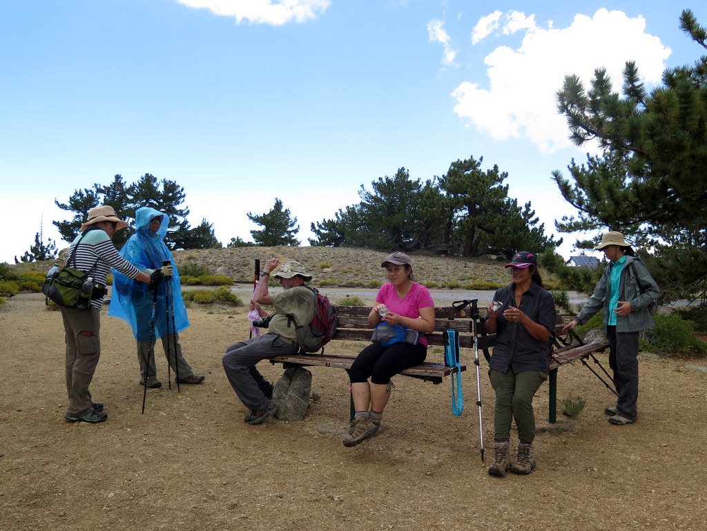 The well-maintained dirt trail then entered the Chumash Wilderness as we descended the open western slope of Mt. Pinos – which displayed a variety of wildflowers, particularly rabbit brush and Indian paintbrush – via switchbacks; we then crossed a saddle and ascended the forested eastern slope of Sawmill Mountain. Then we followed an unsigned “use” trail to the Sawmill Mountain peak (8,818’), marked by a large rock monument where we were greeted by a large contingent of hikers from Santa Clarita’s Community Hiking Club [they had hiked over from Mt. Abel (aka Cerro Noroeste)]. Returning cross-country to the main trail. we descended to a junction with the North Fork Trail (22W02) which we followed as it descended southward half a mile to Sheep Primitive Camp (8,200’) under a stand of Jeffrey Pines. There we took a rest/lunch break and enjoyed the pleasant forest environment. We then retraced our route up Sawmill Mountain and back to the Condor Observation Point. As we climbed the western slope of Mt. Pinos we were lightly pelted by small hailstones (something more often experienced in the Sierra Nevada). After regrouping atop Mt. Pinos on a still-cool day, we hiked back to the parking lot and then returned home having completed a 10-mile hike with 1,875’ of elevation gain/loss.