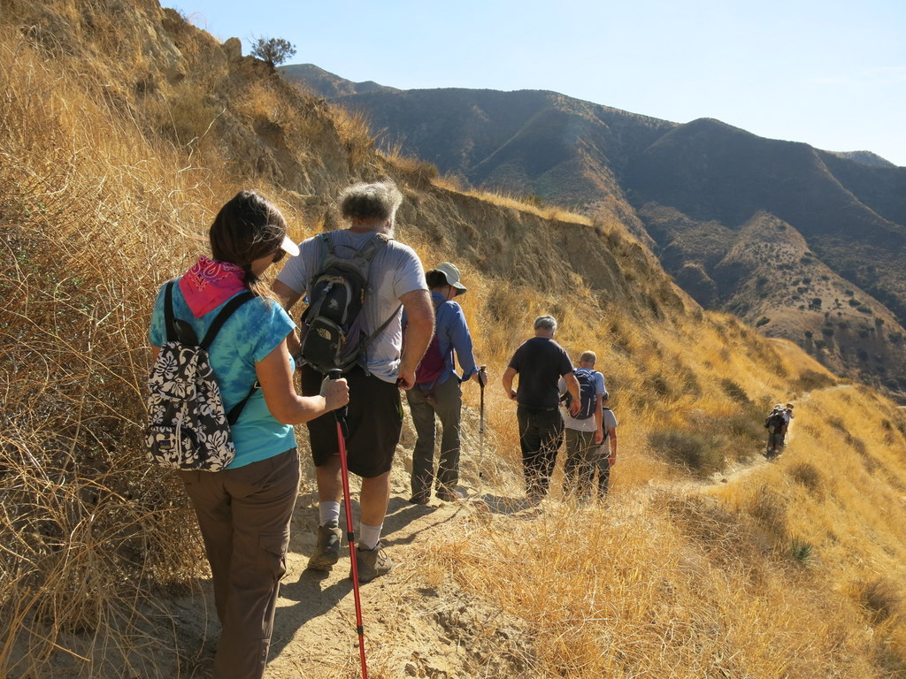 Mentryville was a boomtown between 1876 to 1900. The town had a schoolhouse, social hall, bakery, boarding houses, bunkhouses, blacksmith shop, machine shop, a gas-lighted tennis court, croquet fields, and a main road paved with local asphalt. By the 1930s, most of the town’s residents were gone. By 1962 it was a ghost town. Our hike started about a half mike from the main entrance. We took our time and enjoyed a self-guided tour of the remaining buildings. Not far past the town we passed by the schoolhouse and then Johnson Park. Next we explored the site of the first oil well, finally capped in 1990. The elevation gain was gradual up to this point, but that was about to change. The pavement ended, and about 2 miles later we reached an overlook, which became our turn-around point. The view was expansive, but severely compromised by the smoke from the Canyon 2 fire in the Anaheim Hills. We originally intended to take a single-track trail back to Johnson Park, but deemed it unsafe due to some recent erosion, most likely from the rain last winter. Our hike became an out-and-back instead of a lolipop loop. We all agreed that it was a very successful exploratory hike and would be a perfect candidate for next Spring. There’s still more of the area to explore. Our hike was about 7 ¾ miles with 1,360′ of elevation gain.