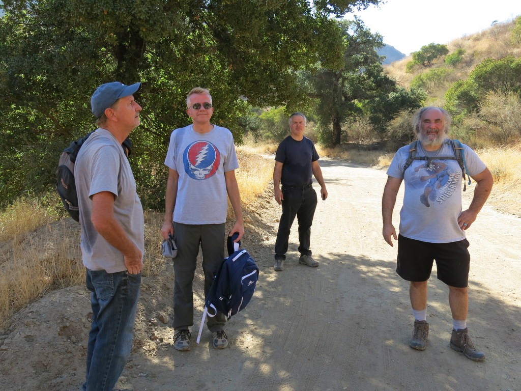 >24 hikers gathered in the Ahmanson Ranch parking lot at the west end of Victory Boulevard in West Hills on a not-yet-hot late-spring morning for a hike in the Upper Las Virgenes Canyon Open Space Preserve which offers a variety of single-track trails and old dirt ranch roads in a landscape of grasslands, rolling hills, and a smattering of ancient oak trees.