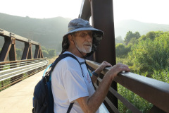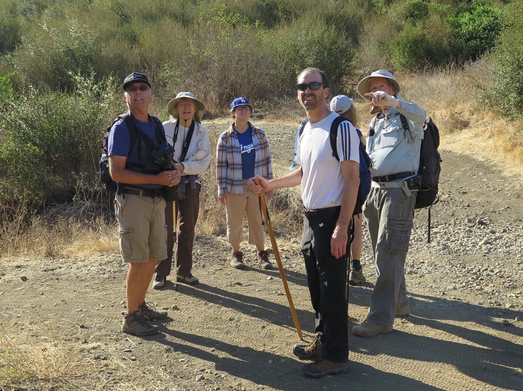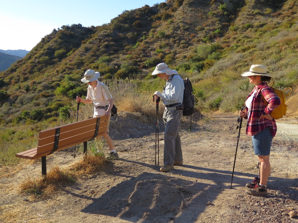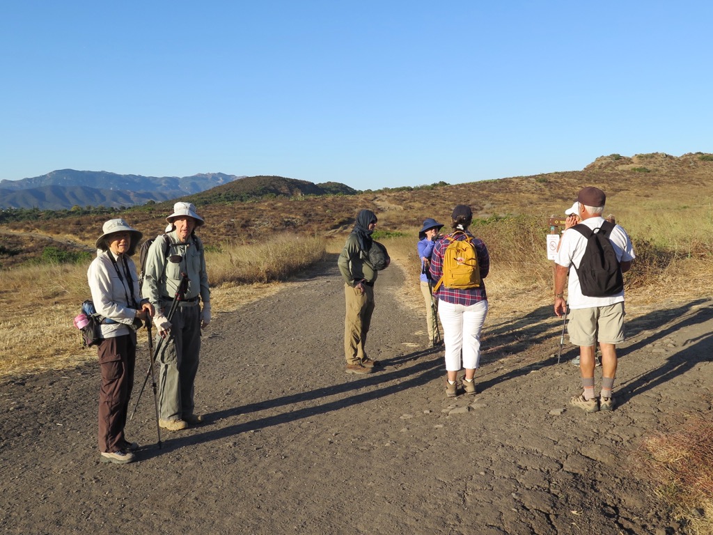 8 hikers met in the dirt parking lot at the east end of Broadway Road north of Moorpark on a pleasant late-autumn morning. As we started we followed a well-maintained trail beside the Rustic Canyon golf course a little over a mile to the entrance to Happy Camp Canyon, “a lush riparian oak woodland with an intermittent stream,” Although the landscape was “lush”, the “stream” was absent due to the lack of recent rain. Passing the junction with the west end of the Middle Range Fire Road, we followed an old ranch road eastward as it gradually rose 600’ in the canyon bottom between Oak Ridge and Big Mountain. At 4.8 miles we took a break in an oak grove with picnic tables and hitching rails. We then split into two groups; one group returned to the parking lot the way we had come; the other group climbed steeply for 0.5 mile up Big Mountain to the Middle Range Fire Road via an abandoned, steep, and partially eroded dirt connector road. Once we reached the ridge (and recovered from the steep climb) we took in the views to the south and west which were relatively clear for several miles, but were hazy at greater distances (for example, we could only see the outline of Santa Cruz Island, the largest of the Channel Islands). After hiking westward while enjoying the views we descended to the entrance to Happy Camp Canyon and we made our way back to the parking lot. The group that chose to hike the loop completed an 11-mile hike with 1,500′ of elevation gain/loss. The group that chose the out-and-back option completed a 9.8-mile mile hike with 985′ of elevation gain/loss. It was a very nice day for hiking.