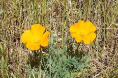 7 hikers met at 8:00 AM at historic Corriganville Park at the east end of Simi Valley on a pleasant-but-soon-to-be-hot early summer morning. We began our hike along the primary north-south dirt road in Corriganville. After passing Camp Rotary we started up the Loop Trail in the western section of the park by crossing the creek that flows through the park. As the trail rose to the west both sides of the trail were adorned by lots of a variety of blooming wildflowers. Soon we reached a trail junction; we turned right (north) to stay on the Loop Trail as it rose more steeply in a counterclockwise direction; soon the trail narrowed due to overgrown bushes for about a fourth of the length of the loop. At the highest point on the Loop Trail we had an excellent view of about half of the park. Next we reached the southwest part of the park where many of the mostly western movies were filmed; there are several signs showing pictures and brief descriptions of parts of this area [a couple of decades ago there were still parts of some of the movie sets but over the years mother nature has destroyed nearly everything that was left]. We finished the Loop Trail by crossing the creek at the “Robin Hood Lake” crossing and returned to Camp Rotary.