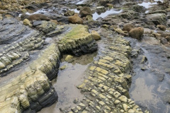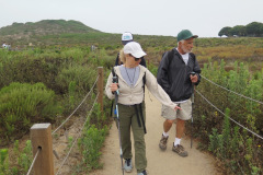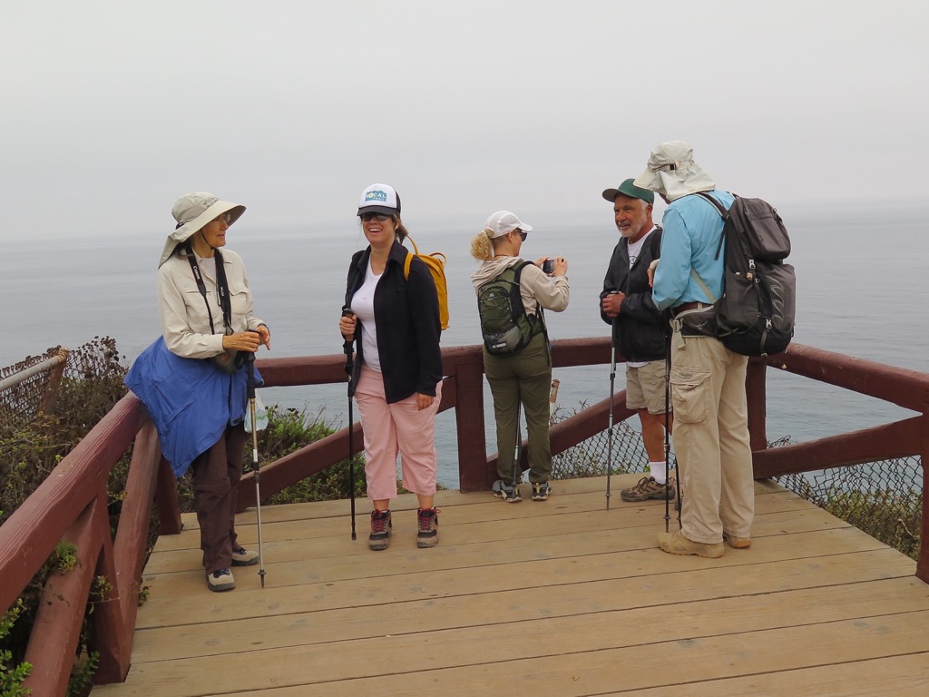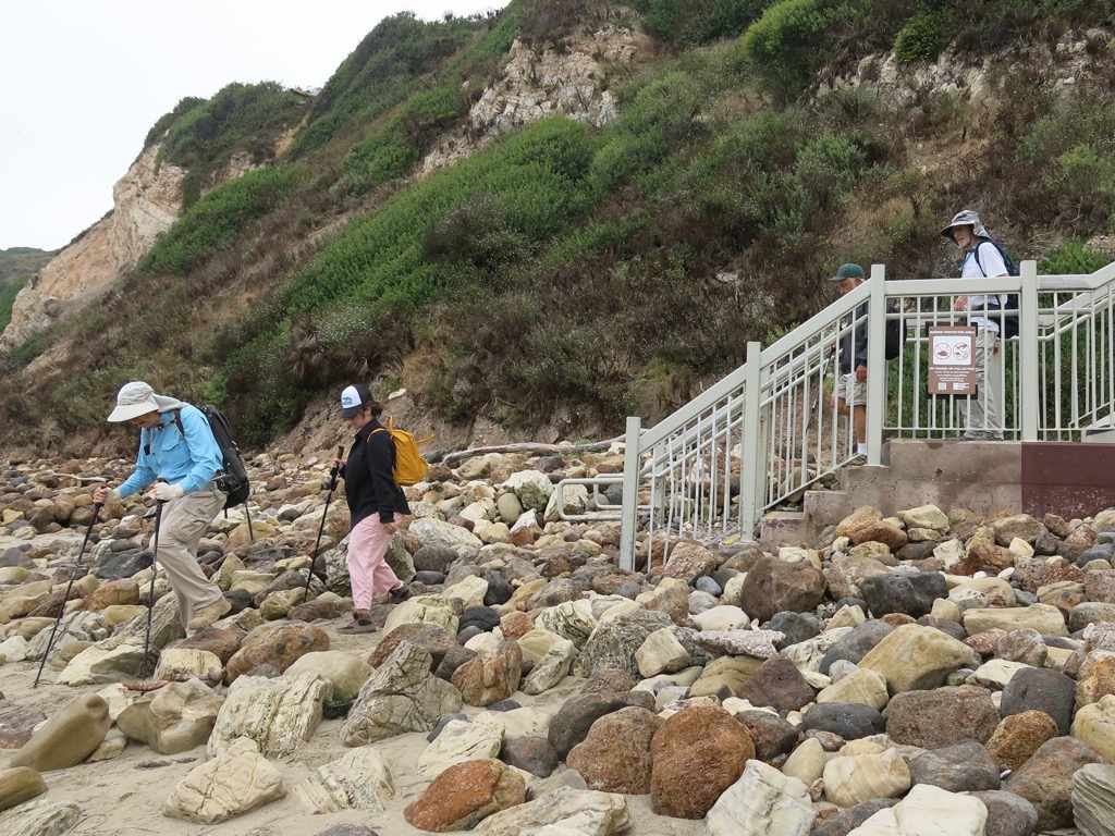 6 hikers traveled to Malibu and Westward Beach Road where some of us took advantage of free parking along the road and then hiked to the parking lot trailhead while others paid to park in the parking lot (which was nearly empty when we arrived). There was a marine layer and the temperature was quite pleasant as we began hiking up onto Point Dume. After an easy climb, we turned right (south) and hiked along a narrow trail in a counterclockwise direction, stopping now and then to look at (and listen to) seals in a rookery on the rocks down below us. There is a maze of trails surrounded by a “forest” of dormant coreopsis plants covering much of the peninsula with a breathtaking view of Dume Cove and the Pacific Ocean on the east side. Note: the coreopsis plants are beautiful when blooming but are singularly ugly when dormant. After gawking at the seals we continued around to the east side of the point and headed north to the beautiful “new” (it replaced the old rusty stairway that was used for a long time) stairway and we descended to Dume Beach.