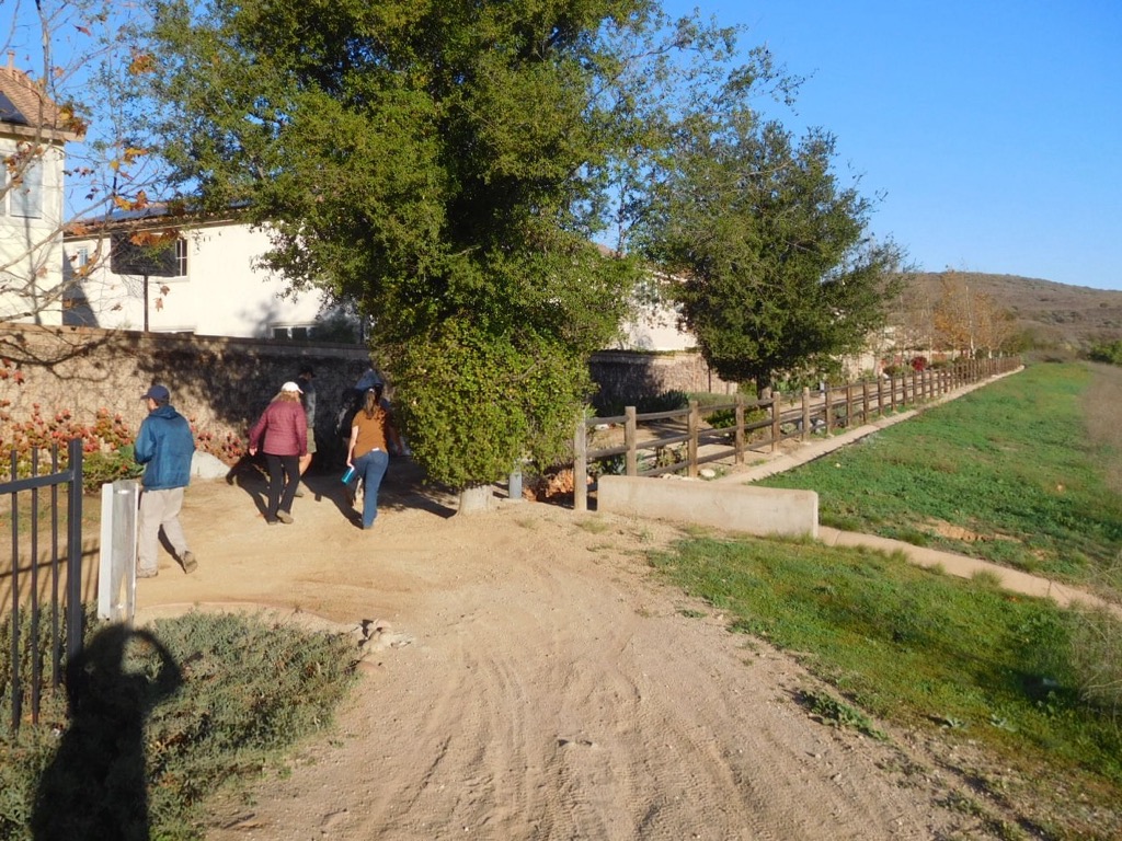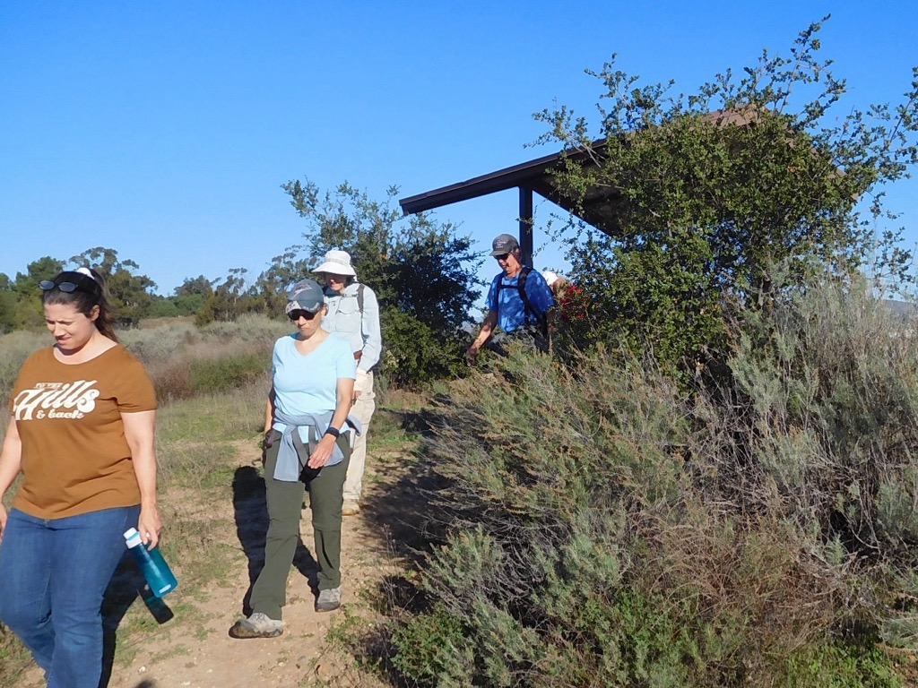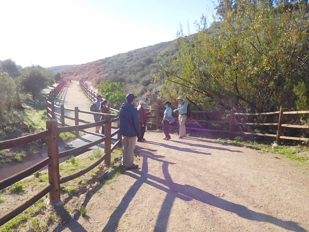 Eleven hikers met at 8:00 AM at Sapwi Trails Community Park off of Erbes road in Thousand Oaks, where the hike began. Going north east on an open space service road, surrounded with trees and lush green grass, we soon arrived at the Sapwi Bike Park, a BMX bike track. As we continued hiking east, we passed a flood control dam adjacent to the Sapwi Trails Disc Golf Course. The trail then followed the flood control basin, shaded by trees on the south side. Eventually the trail ended, emerging onto Westlake Blvd. There we crossed the street and followed Lang Ranch Pkwy to Lang Ranch Neighborhood Park, where we took a short break. Then we crossed the street again at the entrance of the Chumash Indian Museum. The museum didn’t open until 10:00 but we hiked to the Chumash Indian village where we took another short break, then headed back.