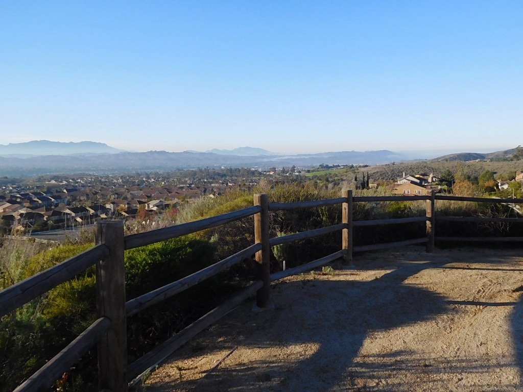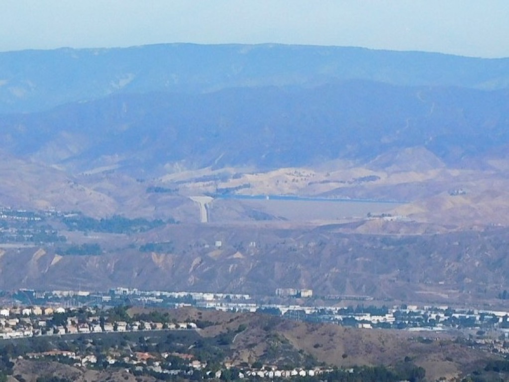 5 hikers met at the carpool point near the intersection of Royal Avenue and Madera Road on a pleasant winter morning and then (since trailhead parking is quite limited) walked from there to the Mt. McCoy trailhead on Washburn Street a few blocks to the west. The hike began along the trail heading south but it quickly began climbing gradually westward along the well-maintained (but frequently “cut” by bicycle riders) trail leading to the summit via a series of switchbacks. We took our time as the trail rose up the mountainside; we were rewarded with views of the western end of Simi Valley, including Sinaloa Lake, Wood Ranch, and the Bard Reservoir. There is a white concrete cross (erected in 1941) as well as two concrete benches at the summit, from which the Ronald Reagan Presidential Library can be seen. After a short break to enjoy the panoramic view of the desiccated landscape, we returned the way we came completing a 3.25-mile hike with 650’ of elevation gain/loss