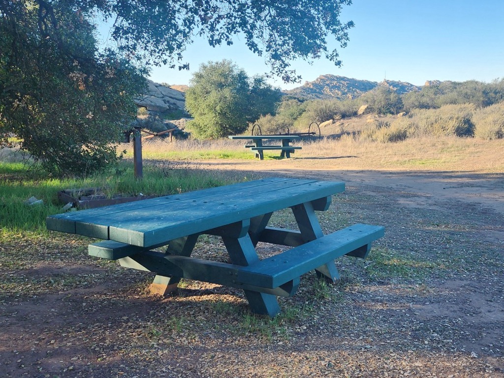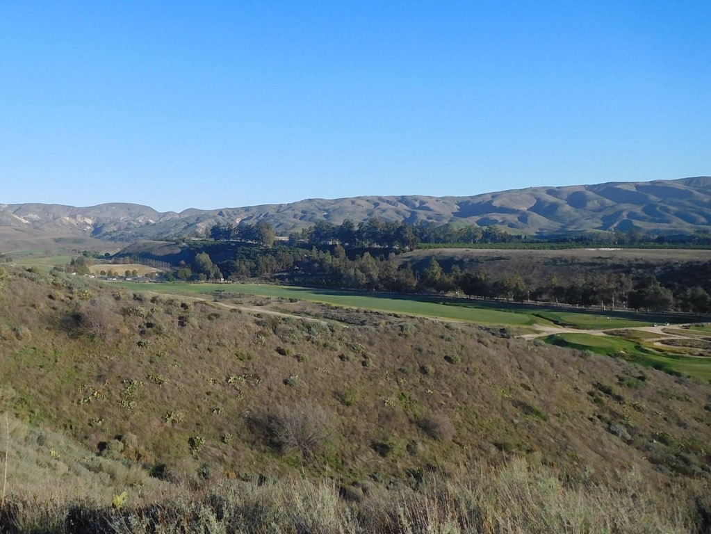 7 hikers met in the dirt parking area at the north end (15100) of Happy Camp Canyon Road adjacent to the Rustic Canyon Golf Course parking lot in Moorpark on a cool autumn morning. We followed the trail (dirt road) along the east side of the golf course until we reached the signed kiosk entrance to Happy Camp Canyon. We took the left fork just past the signed entrance and followed the old ranch road eastward as it rose 600’ gradually in the canyon bottom between Oak Ridge (to the north) and Big Mountain (to the south). A relatively easy several miles later we reached a shaded picnic/rest area with two tables with benches, two hitching rails, and lots of shade provided by oak trees. After a very pleasant break all of the hikers decided to continue hiking the loop [rather than returning the way we came].