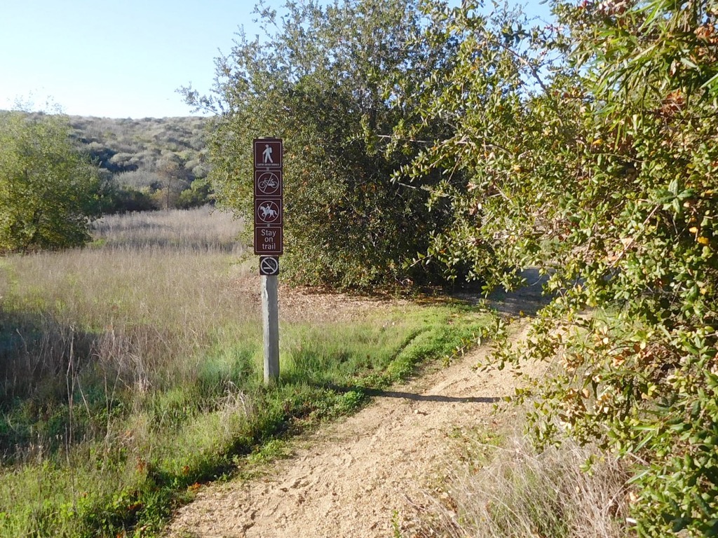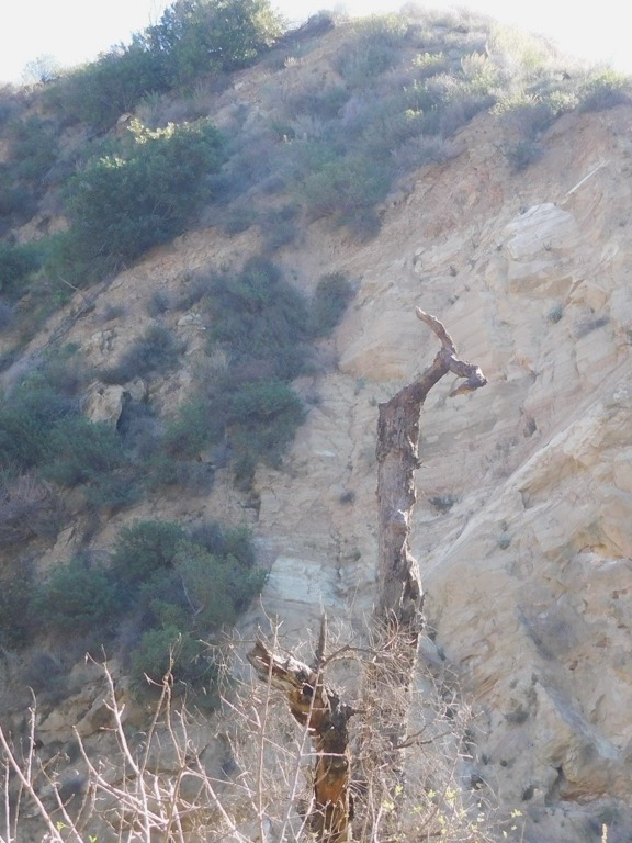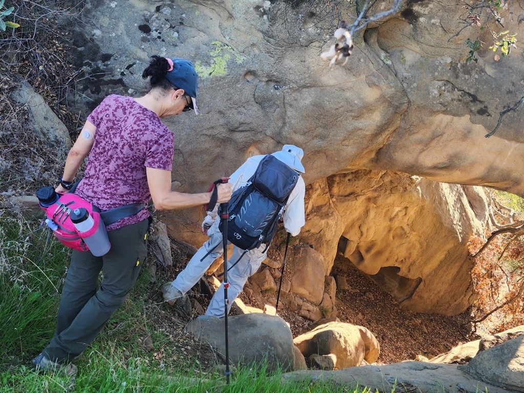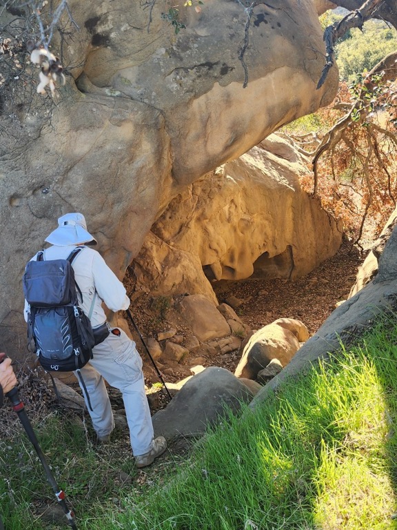It was a chilly foggy winter morning (which warmed up nicely during the hike) when we met at 8:00 AM at the main Wildwood Park parking lot at the west end of Avenida De Los Arboles in Thousand Oaks. Heading westward, we began our clockwise loop hike along the Mesa Trail. There were no other hikers and no bicyclists (presumably because it was New Years Day). Shortly after we began our hike we turned left (south) onto the Tepee Trail and followed it down into Wildwood Canyon, stopping to visit the “Little Cave” along the way.