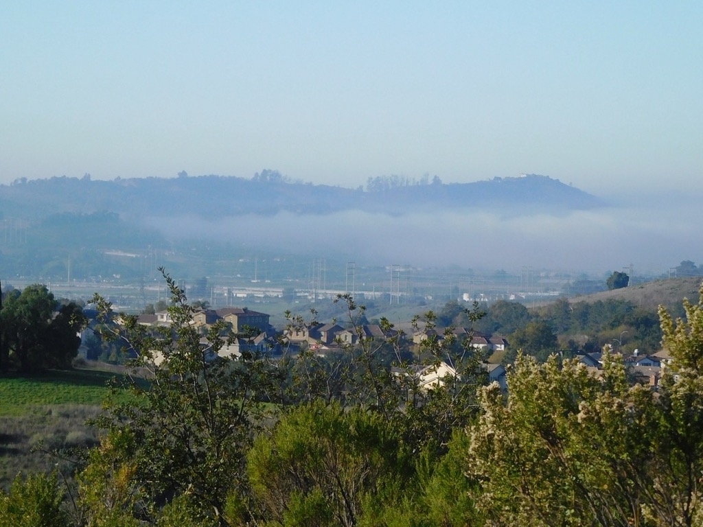 8 hikers met at 7:00 AM along College Heights Drive in Moorpark, CA not far from the 6786 residence on a pleasant summer morning. We headed west along a well-maintained trail passing Mammoth Highlands Park. After crossing Ridgecrest Drive we began gaining elevation as we climbed up to a ridge that afforded us with expansive views of Happy Camp and northern Moorpark. Since the early morning was somewhat foggy we couldn’t see Santa Cruz Island in the distance but we enjoyed the views that we did have. The trail continued along the perimeter of a gated residential area which we followed until we reached an intersection with a steep single-track trail that led up to an overlook with a covered bench.