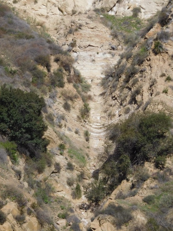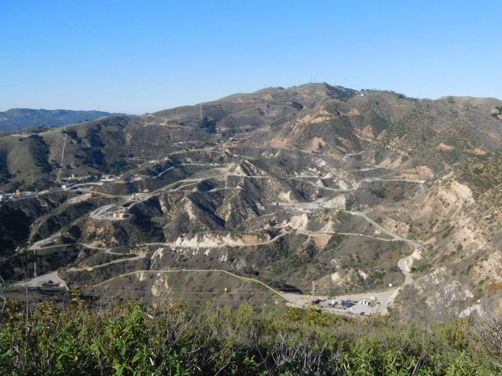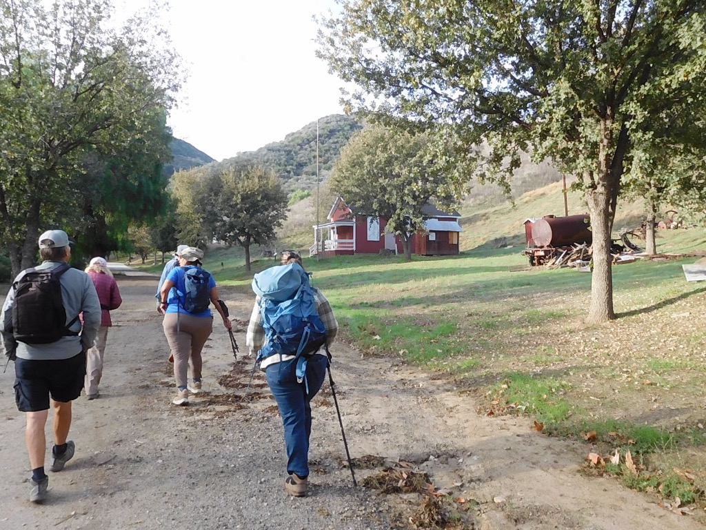 After taking a quick tour of the “ghost” town, we headed southwest along the paved road into shady Pico Canyon with its towering walls and a pleasant stream until we reached Johnson Park (“the party place for oil miners of more than a century ago”) where we dallied for a while. As we continued further into the canyon, the paved road made a sharp switchback to the northeast, became a dirt road, and we began climbing up out of the canyon. As we gained elevation our views of the surrounding rugged landscape with green mountainsides (thanks to fairly recent rainfall) steadily improved. As we continued southeast toward the road’s upper end we had excellent views of the transverse range of the Santa Susana Mountains as well as parts of the Santa Clarita Valley. The road ended in a wide flat mountaintop area which was at one time the home of the Union Oil Company’s Odeen #1 oil well, but is now the home of a lone picnic table with two benches. After a leisurely snack/rest break, we returned the way we came and reached our vehicles, having completed an 8.25-mile hike with about 1,450’ of elevation gain/loss on a very nice day for hiking.