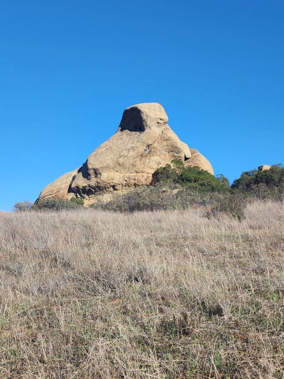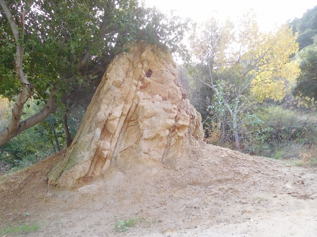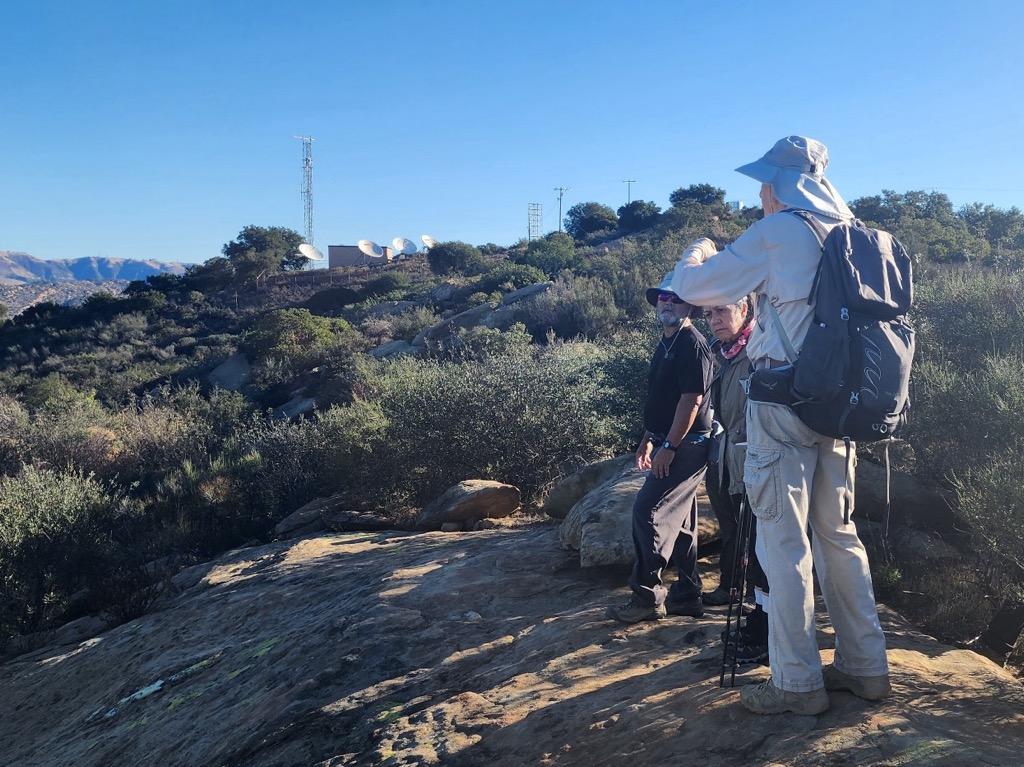 After successfully navigating Black Canyon Road 6 hikers arrived at the lower parking lot in Sage Ranch Park in the Simi Hills on a pleasant autumn morning. The 625-acre park is located just north of the Santa Susana Field Laboratory (SSFL) (aka Rocketdyne/Boeing) at an elevation of 2,000’. It is chock-full of world-class sandstone rock formations and has lots of picnic tables shaded by large oak trees in a picnic/camping area. Shortly after we began our counterclockwise loop hike, we were rewarded with sweeping views of Simi Valley and the mountains to the north as we followed several “use” trails as we headed westward. Not long after we returned to the loop trail/dirt road, we reached a “use” trail and climbed up on Sandstone Ridge (aka Sugarloaf), a long, steep rock formation rising alongside the trail on the west side of the park; it afforded us with excellent views of the once-bustling SSFL (most of the structures have been removed from the property as the cleanup effort “continues”).