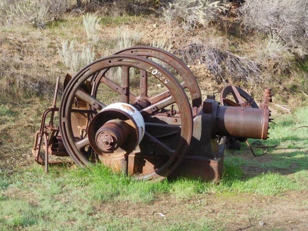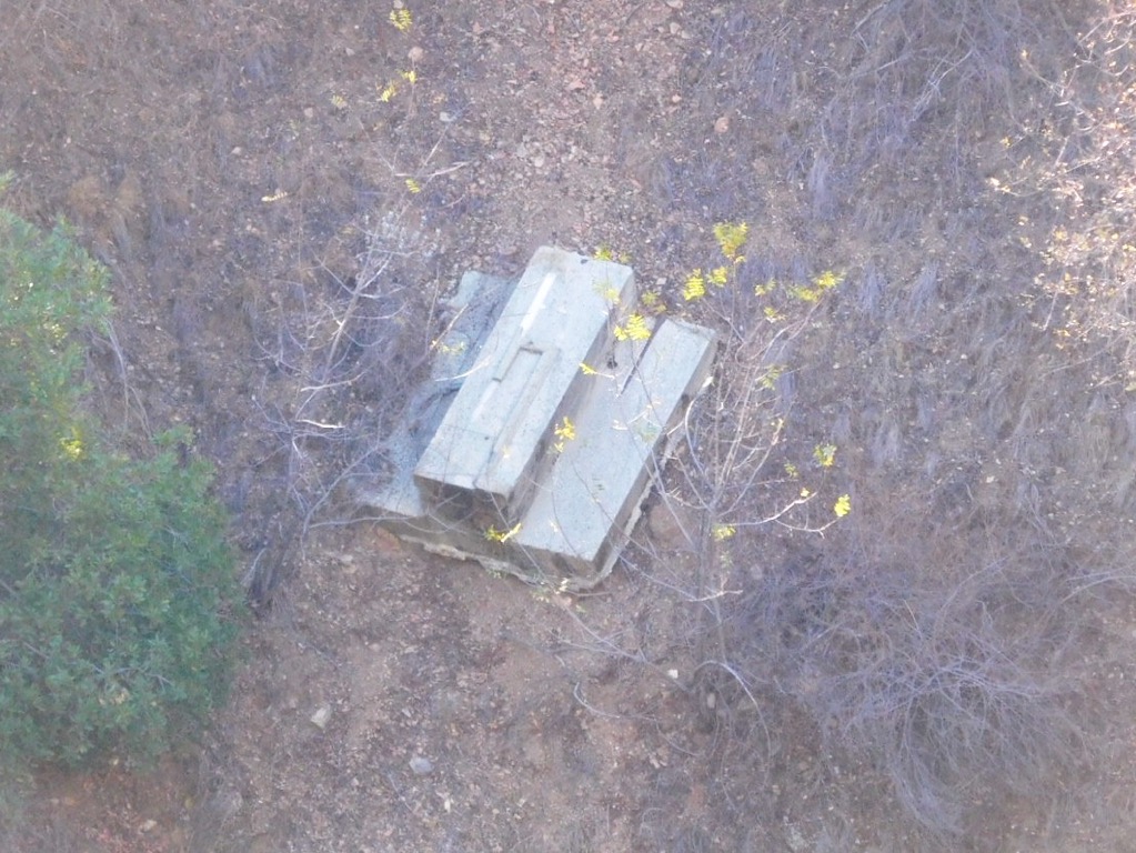 Northbound we climbed up the eastern slope of the mountain, atop which there are panoramic views of the surrounding area including parts of Chivo Canyon, Las Llajas Canyon, the Santa Susana Mountains, and Simi Valley. We took a break when we reached our goal, the site of a coquina (a soft whitish limestone formed of broken shells and corals cemented together and used for road building) mining operation. Various mining equipment artifacts are strewn about near the mining site, most notably a P&H Model 206 shovel.