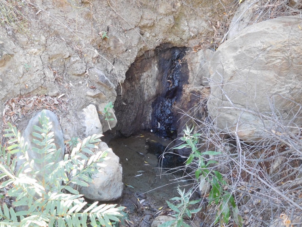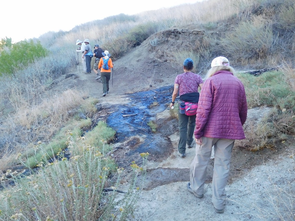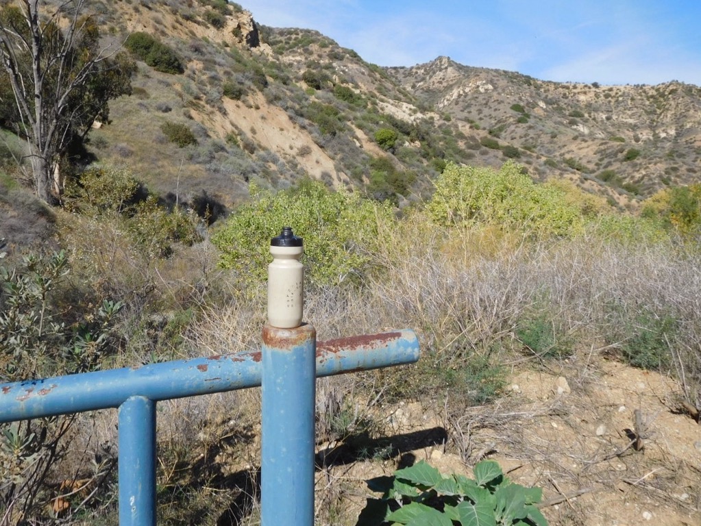 The hikers turned right and began hiking the T23 loop which took them along a dirt road/trail that led downward through an oak woodland toward its eastern junction (1,276’) with itself. They then turned right (leaving the loop) and descended into Chivo Canyon (1,224’) where they took a short break at the ever-popular oil seep. They then retraced their steps to the T23 loop where they took the right fork and followed T23 back to the narrow pass, completing the loop, where they returned to the original trailhead. They completed their mostly pleasant outing having hiked 5.1 miles with a total elevation gain/loss of 713’. Several rabbits and some birds were seen along the way, along with a few other hikers, and lots of bicyclists, on a pleasant Saturday morning.