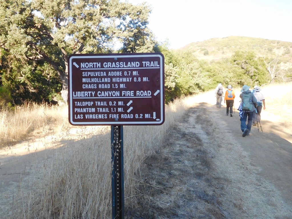 8 hikers assembled at the starting (and ending) point of our planned loop hike in Malibu Creek State Park on a pleasant early autumn morning. We began hiking northward along the North Grassland Trail as it passed through a landscape covered with dried grass and dotted with oak trees blackened by the Woolsey Fire. We soon reached the dirt Liberty Canyon Fire Road which we followed through the oak-dotted rolling hills of the Liberty Canyon Natural Preserve to the Phantom Trail’s northern trailhead. Soon we began climbing steadily up a still-heavily-wooded slope heading southward until we crested high on a ridge. Continuing southward along the ridge we enjoyed distant views of the surrounding area which was still surprisingly green. There were a few blooming wildflowers, mostly sunflowers.
