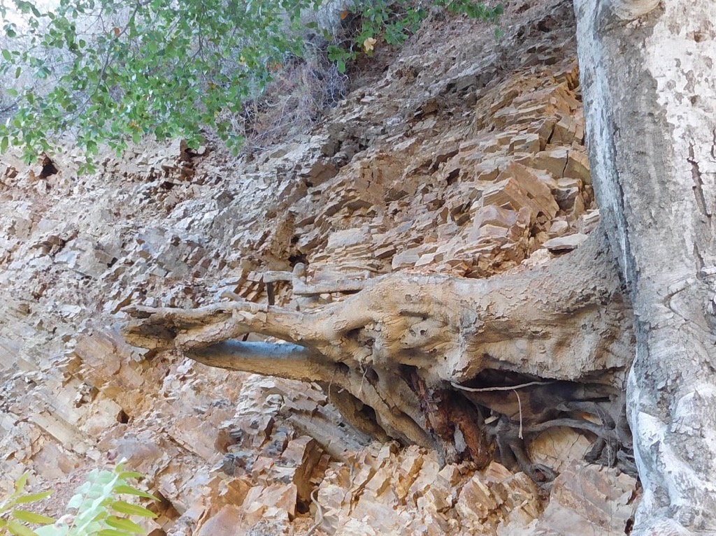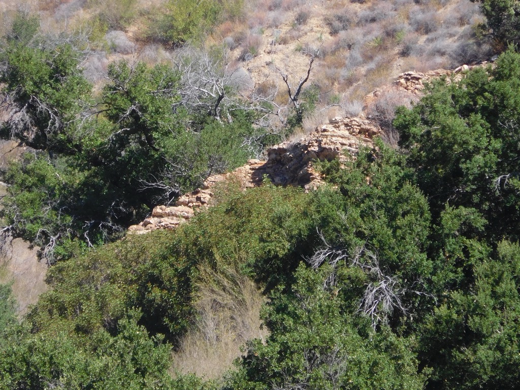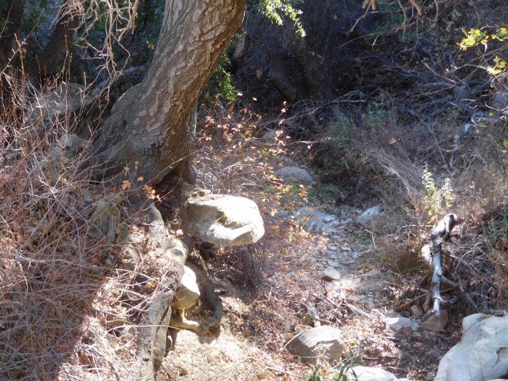 Six hikers met at 7:00 AM at the starting point of our hike on Poema Place in Chatsworth on a very pleasant late summer morning. We began our hike by descending into the heavily shaded bottom of Devil Canyon where we followed the remnants of the Devil Canyon Motorway upstream as it frequently crisscrossed the dry stream bed. We zigzagged our way along the trail until eventually we reached the large check dam at the junction with the mouth of Ybarra Canyon (which extends north to the Regional Park at Joughin Ranch). This first part of our hike led through a mostly heavily shaded environment bordered with interesting rock formations, and quite a bit of poison oak.