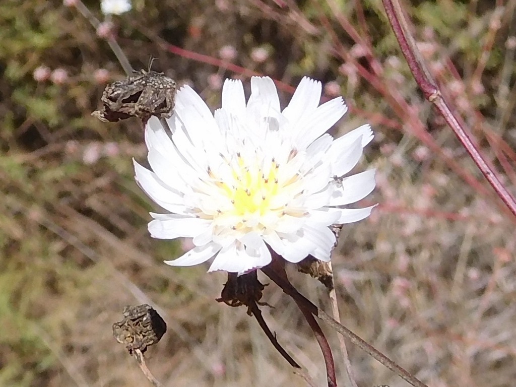 9 hikers met at 7:00 AM at the Chumash Trail trailhead at the northeast end of Flanagan Drive in Simi Valley on a cool morning that promised to heat up considerably in a few hours. We hiked steadily up the trail as it rose through a rocky landscape until we reached the Rocky Peak Fire Road (our turnaround point). We were grateful that we were not in the direct sunlight during most of our ascent. Part way up the trail we spotted a non-moving rattlesnake near the trail (it showed no sign of being alive and was still there on our way back down so it may have been dead). We also spotted a couple of rabbits on the way up. After resting for a while at the turnaround point on the Rocky Peak Fire Road, we returned the way we came, again “beating the heat,” as we completed a nice 5.5-mile hike with an elevation gain/loss of 1,294’. We encountered quite a few other hikers and several bicyclists. Almost nothing was blooming, except for Cudweed Aster and Narrowleaf Tarweed; the landscape was “bone dry” due to the normal drought at this time of year.