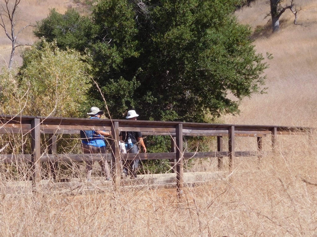 8 hikers met in a dirt parking area on the left (east) side of Hill Canyon Road in Santa Rosa Valley Park on a somewhat chilly summer morning forecast to become very hot as the day progressed. We began our hike [at 7AM] by crossing a 25-foot-wide bridge over the Arroyo Conejo (creek). We headed south along the Hill Canyon dirt road for about three quarters of a mile until we reached a nameless spur trail leading down to the edge of Arroyo Conejo; it then led us parallel to the creek to a short connector trail that led all the way down to the edge of the creek which pleasantly flowed through the wooded area.