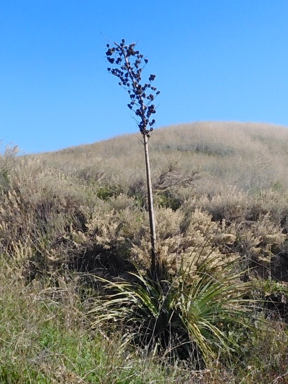 Continuing our hike, we followed the nicely graded/widened dirt road southeast as it rose from the canyon bottom up Big Mountain to the Middle Range Fire Road. NOTE: This section had been an abandoned, steep, and partially eroded dirt connector trail (formerly a road) for several years. It is now well- maintained by comparison which made it easier to climb. Once we reached the ridge we took in the views to the south and west but much of Simi Valley was hazy. After hiking westward a few miles we descended to the signed kiosk entrance to Happy Camp Canyon, and then we made our way back to the parking lot the way we came, thus completing an 11-mile hike with about 1,420’ of elevation gain/loss on a nice morning for hiking .The mountainsides were “bone dry” due to the annual drought but there were a few blooming plants including datura. We encountered very few other people during our hike.