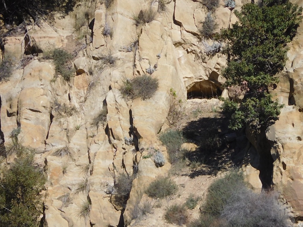We resumed our hike southward and then eastward on the loop trail until we reached the “detour” section of the trail and a “temporary” fence blocking a section of the original loop trail. The “temporary” blockage was caused by a planned cleanup of the former trap-and-skeet range in the park. We eagerly turned onto the “detour” trail which led us northward through the center of the ranch, thus providing us with views of a previously unseen section of the park. Part way along the “detour” section we decided to pass by a “use” trail that leads a short distance eastward up to an overlook down into an otherwise hidden canyon with interesting rock formations and heavy foliage. We completed our relatively short, but quite scenic, stroll around and through the park having hiked about 3 miles with 600’ of elevation gain/loss. As expected, the landscape was “bone dry” due to the annual drought.