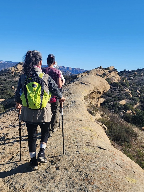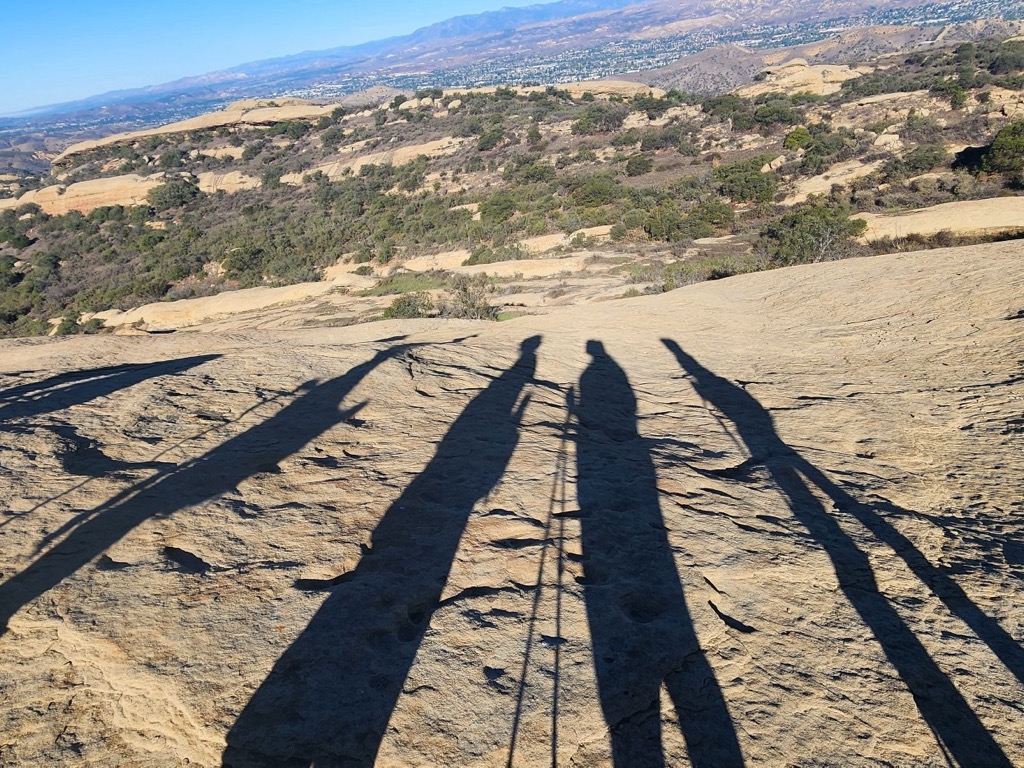 5 hikers assembled at the on-street-parking area at the north end of Kuehner Drive at the trailhead (1,175’) for the Hummingbird Trail (just outside the gate into Hummingbird Ranch) on a chilly but pleasant winter morning under a blue sky. We began our 2.3-mile eastward climb to the Rocky Peak Fire Road, taking in the increasingly wide views to the west as we gained elevation. The trail passed through (and on) a variety of imposing rock formations along the way including very large boulders and giant slabs of sandstone rock, many with small “caves.”
