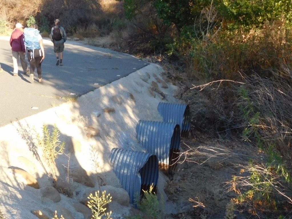 Eleven hikers met at 7:00 AM at historic Corriganville Park at the east end of Simi Valley on an extremely pleasant summer morning. We began our hike at the Old Stagecoach trail and followed east it to the junction of the Lower Stagecoach Trail. Crossing the dry streambed, we headed northwest enjoying the view of Corriganville and the valley below. Soon we came to the junction of the Interpretive trail and turned north to check out the tunnel that goes under the 118 freeway, part of the Wild Life Corridor. After a short break we turned around and headed down the Lower Stagecoach. Passing Camp Rotary, we started up the Loop Trail in the eastern section of the park by crossing the (dry) creek that flows through the park. After seeing some rock cairns and a maze, the trail gradually rose to the west where we Soon reached a 3-way trail junction. Taking the middle trail and following it in a counterclockwise direction, we descended into a large open space until reaching the primary trail on the south side of the park. Many of the old western movies were filmed here, having several signs showing pictures and brief descriptions of movie sets filmed decades ago. There were still parts of some of the movie sets but over the years mother nature has destroyed nearly everything that was left. We finished the Loop Trail by crossing a bridge at the west end of Robin Hood Lake where below, in the concrete dam structure, underwater portholes for filming underwater scenes are still visible. We completed our outing having hiked 3.38 miles with 530’ of elevation gain/loss ending in a very busy park filled with young runners in training.