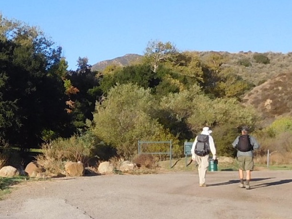 6 hikers met on a pleasantly cool early autumn morning at the Wendy Trail trailhead on Potrero Road at the south end of Wendy Drive in Newbury Park (which borders the Santa Monica Mountains National Recreation Area). We began our hike by following the Wendy Trail to the Satwiwa Native American Indian Culture Center (with restrooms) at Rancho Sierra Vista and then heading southeast around the adjacent grassland to the Danielson Road leading to the Danielson Memorial. The trail (a dirt road) climbed for a while before dropping into Upper Sycamore Canyon and crossing its dry creek bed.