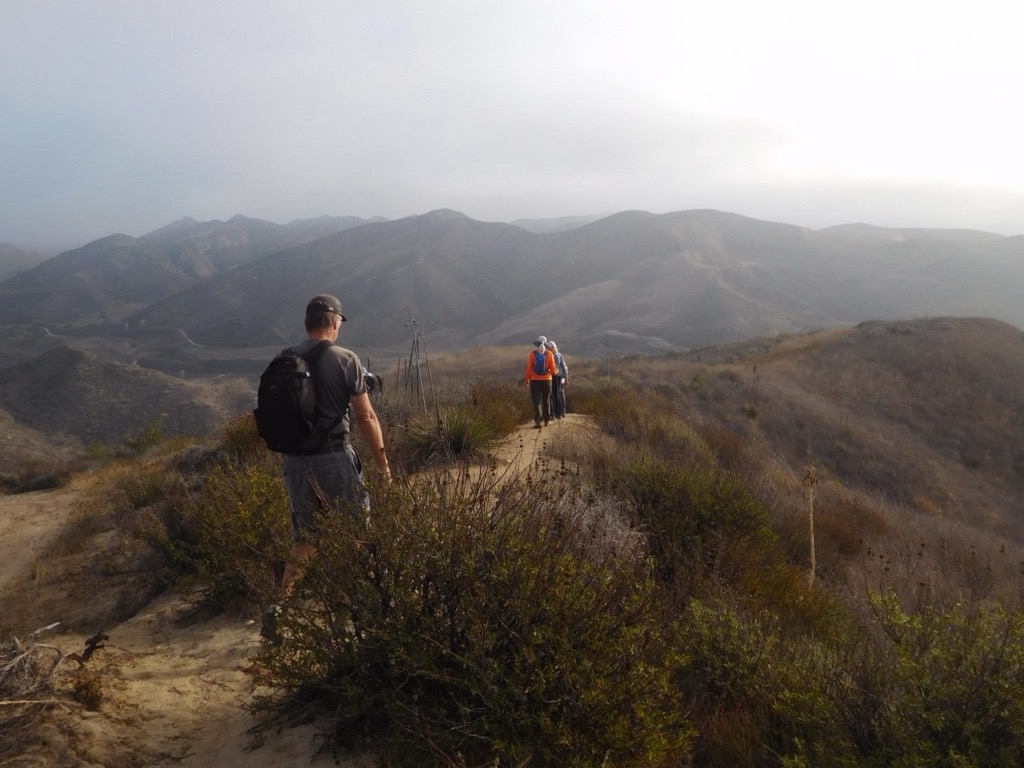 Eight hikers and 1 dog met at 7:00 AM at the main Wildwood Park parking lot at the west end of Avenida De Los Arboles in Thousand Oaks. The parking lot was nearly empty when we arrived, on a densely overcast morning. Happy to see old and new friends, we began our counterclockwise loop hike by heading west on the Mesa Trail. Soon we turned left (south) and hiked a short distance on the Tepee Trail until turning right (west) when we came to the Stagecoach Bluffs Trail which rose steadily uphill with hazy views of the hillsides dotted with prickly pear cactus.