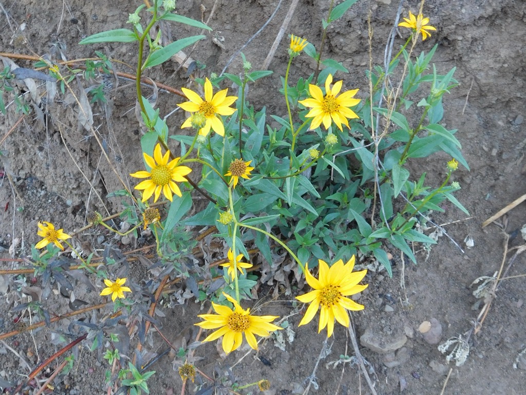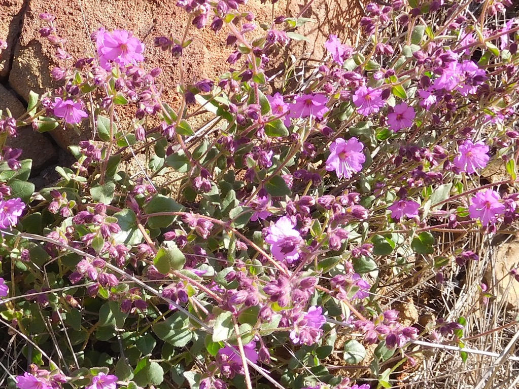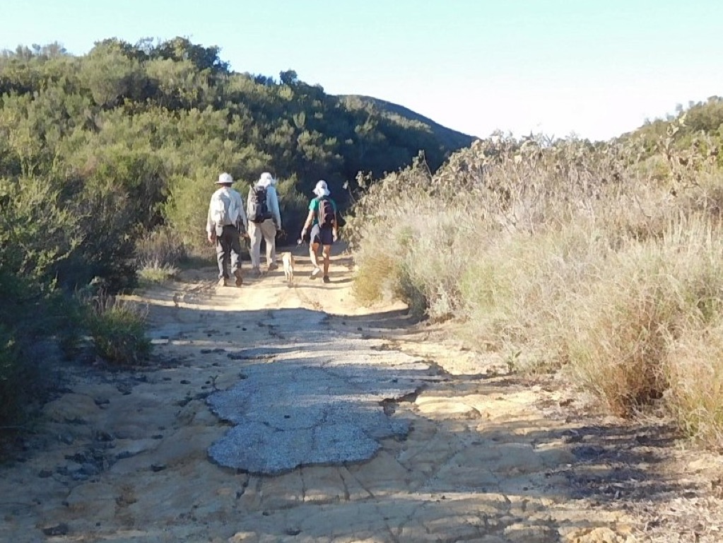 Nine hikers met at 7:00 AM in the dirt trailhead parking area for the Tapo Canyon Open Space Trail (T23) in Simi Valley on a pleasant morning. We began our hike heading northward along the nearly flat dirt road/trail that was partially shaded by high clouds. After a mile or so the road/trail rose steadily to a narrow pass and a dirt-road junction where we took a break and enjoyed the views of the “valley” before us and the rows of mountainous ridges to the northeast. Continuing, we turned right and began hiking the T23 loop, which took us along a dirt road/trail that led downward through oak woodland toward its eastern junction with itself where we saw a mule deer. We took the left fork and descended into Chivo Canyon where we looked at the now famous Simi Tar Pits. We retraced our steps to the T23 loop where we took the left fork and followed T23 through an oak woodland upward to the narrow pass (completing the loop) and then we returned to the original trailhead. We completed our pleasant outing having hiked 5.44 miles with a total elevation gain/loss of 793’ on a nice morning for hiking. We saw small patches of bombing plants including, seaside heliotrope, datura, telegraph weed and California fuchsia.