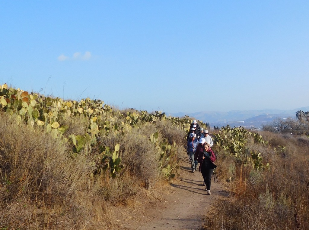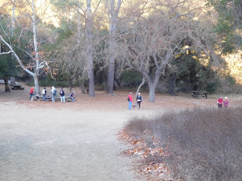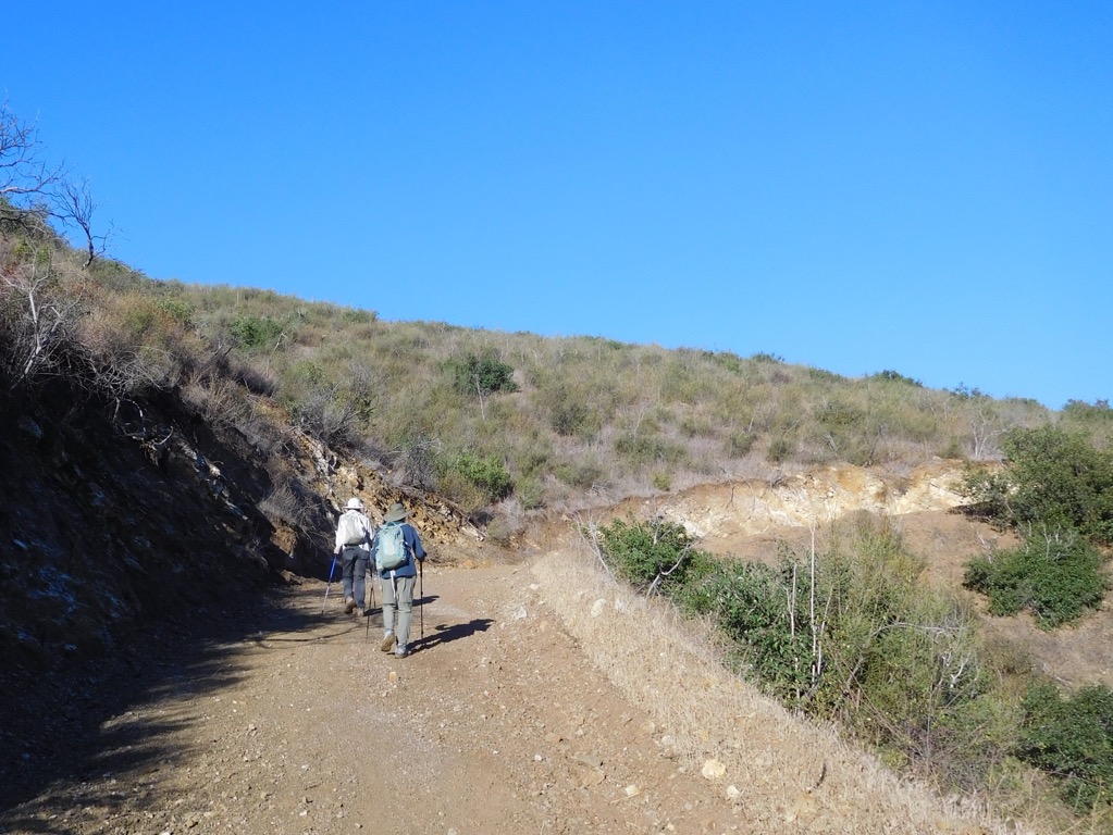 The early winter morning sky was a bright blue behind scattered high clouds when 14 hikers with 2 dogs met at 8:00 AM at the main Wildwood Park parking lot at the west end of Avenida De Los Arboles in Thousand Oaks The parking lot was nearly empty when we arrived (but completely full when we finished). We began our counterclockwise loop hike by heading west on the Mesa Trail. Soon we turned left (south) and hiked a short distance on the Tepee Trail until turning right (west) when we came to the Stagecoach Bluffs Trail which rose steadily uphill affording us with views of hillsides dotted with prickly pear cactus and soon we could look down into Wildwood Canyon below.