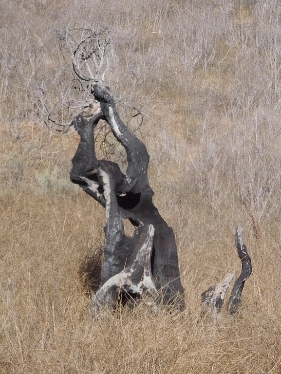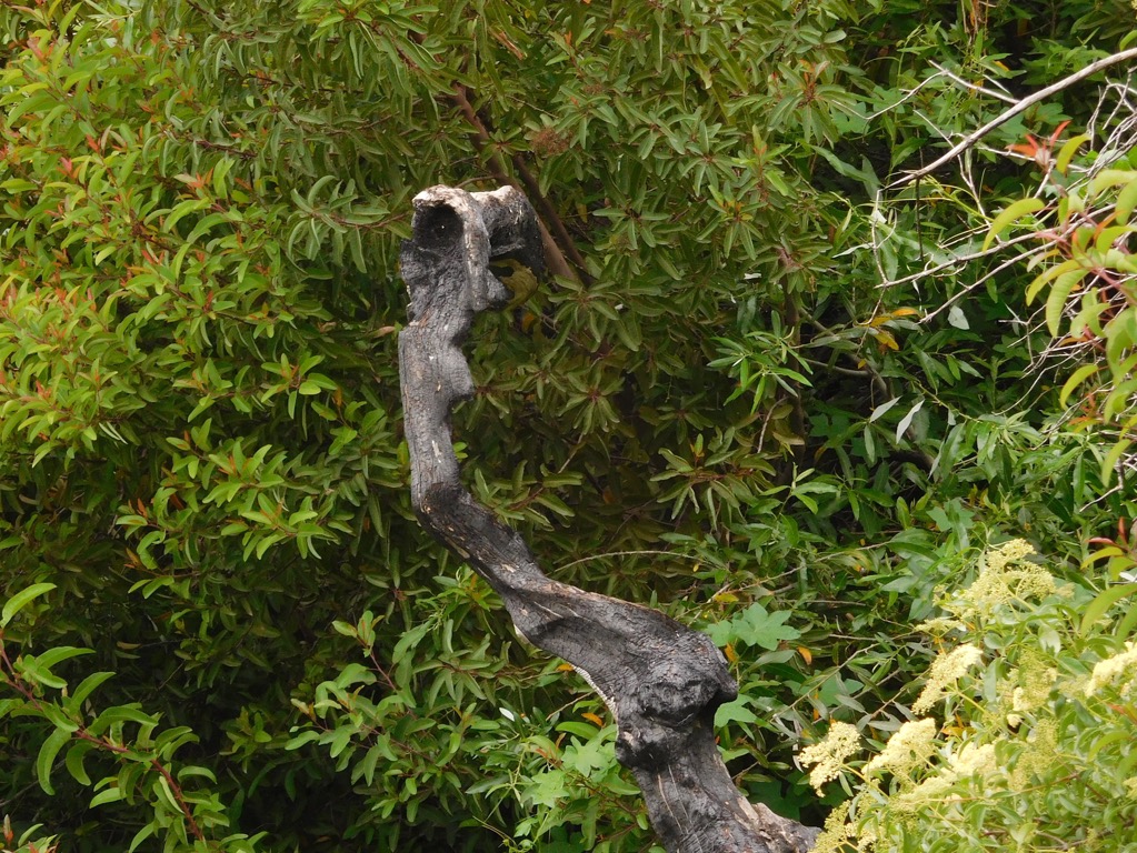 Seven hikers met on Westwood Street in the Wild Horse Canyon housing development in northeastern Simi Valley on a cloudy morning. After a short walk to the mouth of nearby Chivo Canyon we began hiking northward for about 0.7 miles, passing some abandoned mining equipment and a local oil seep. Reaching a trail junction, we turned left (west) and began hiking a short distance on a fairly well-maintained connector trail until coming to the east junction of the Tapo Open Space Loop Trail. Taking the right fork, the trail began adorned with trees and shrubs. After passing a divinely decorated tree stump, the shrubbery thinned as the trail wound through a grassy dell, and gradually got steeper until it rose to the high point of our hike. There we took a short break and enjoyed the views.