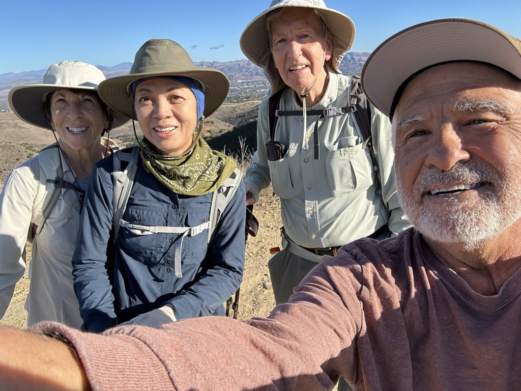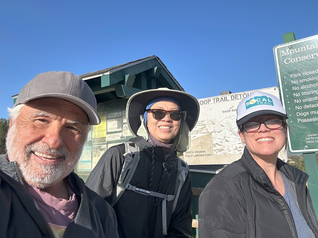 Eleven hikers and a cute dog gathered at 8:00 AM at the Donut Delight parking lot on a chilly [but wind-free] winter morning. We crossed Madera Road, walked the short distance to the west end of Royal Avenue and then headed up Washburn Street to the trailhead. We began our climb up the trail’s many switchbacks, enjoying our first opportunity to hike after the recent very strong winds and the resulting destructive wildfires in Los Angeles and Ventura Counties abated and the red-flag warnings stopped. Upon reaching the cross at the top of Mt. McCoy, we stopped for a short break. The sun was out and the morning had warmed up some. We enjoyed the views in all directions. Before long we headed toward the presidential library, passing the nearby water tank and then following the service road to Presidential Drive which we followed up to the library. After we took a lengthy break at the tables outside the library enjoying what had become a very nice morning, we began returning the way we came.