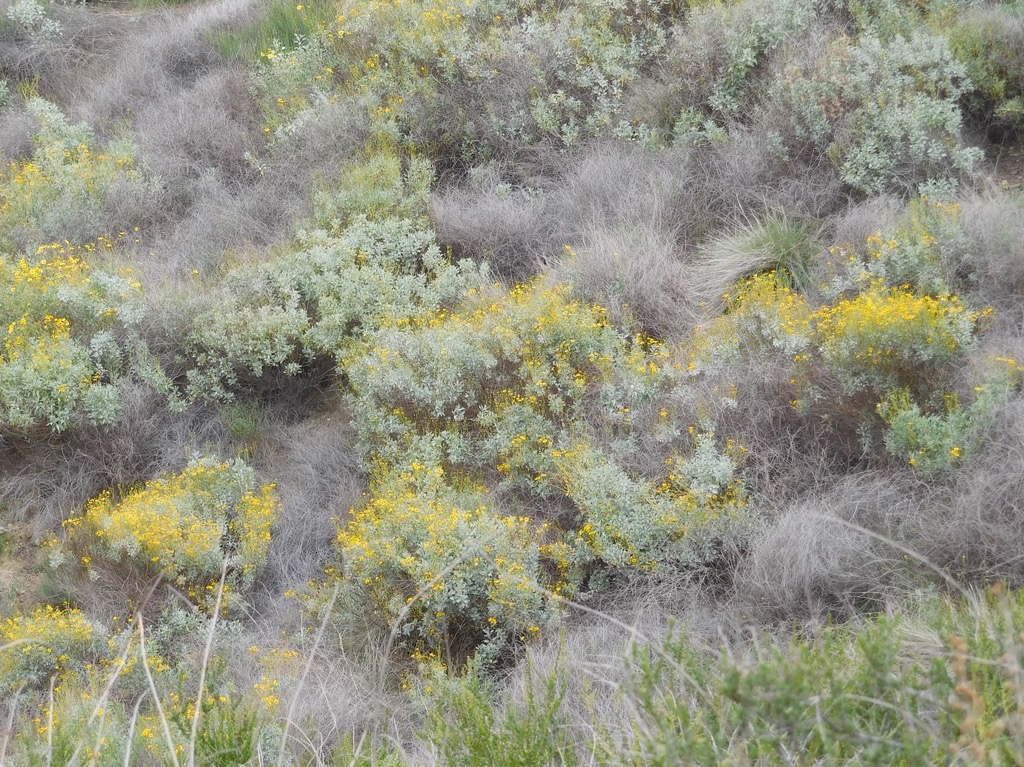 There were some blooming flowers along our hiking route that included (but not limited to) wishbone bush, tree tobacco, datura, California sunflower, sugar bush, western wallflower and a lot of prickly phlox. The surrounding hills were a splendid blend of deep green for a vastly enjoyable hike.