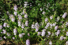 Three hikers met at the trailhead in the “East Canyon, Rice Canyon, and Michael D. Antonovich Open Space” section of the 4,000-acre Santa Clarita Woodlands Park via Interstate 5 and “The Old Road” in Santa Clarita. The sun was shining and the air was fresh and pleasant. The hike begins southward along the partially maintained East Canyon Motorway, following a small creek in the canyon bottom. The route was lined with bay laurel, healthy black walnut, cottonwood, sycamore, and oak trees. Soon the dirt road began rising more steeply along the western side of a wooded ridge, yielding new growth and blooming plants that included, disk mayweed, sticky monkey flower, golden yarrow, common vervain, winecup clarkia, caterpillar phacelia, lupin, Chinese houses, fiesta flower, California poppy. We enjoyed views of the steep slopes to the west and relics of the Bigcone Douglas-fir trees that once covered the mountain.