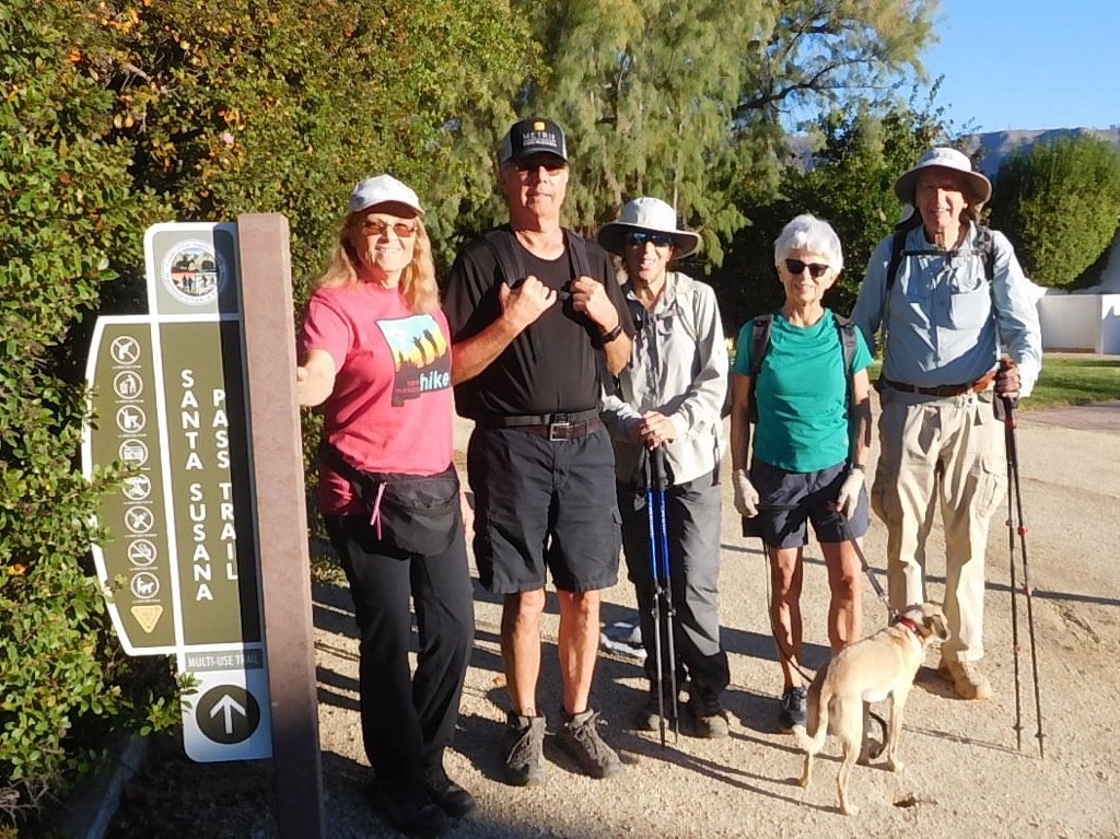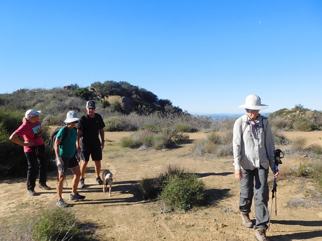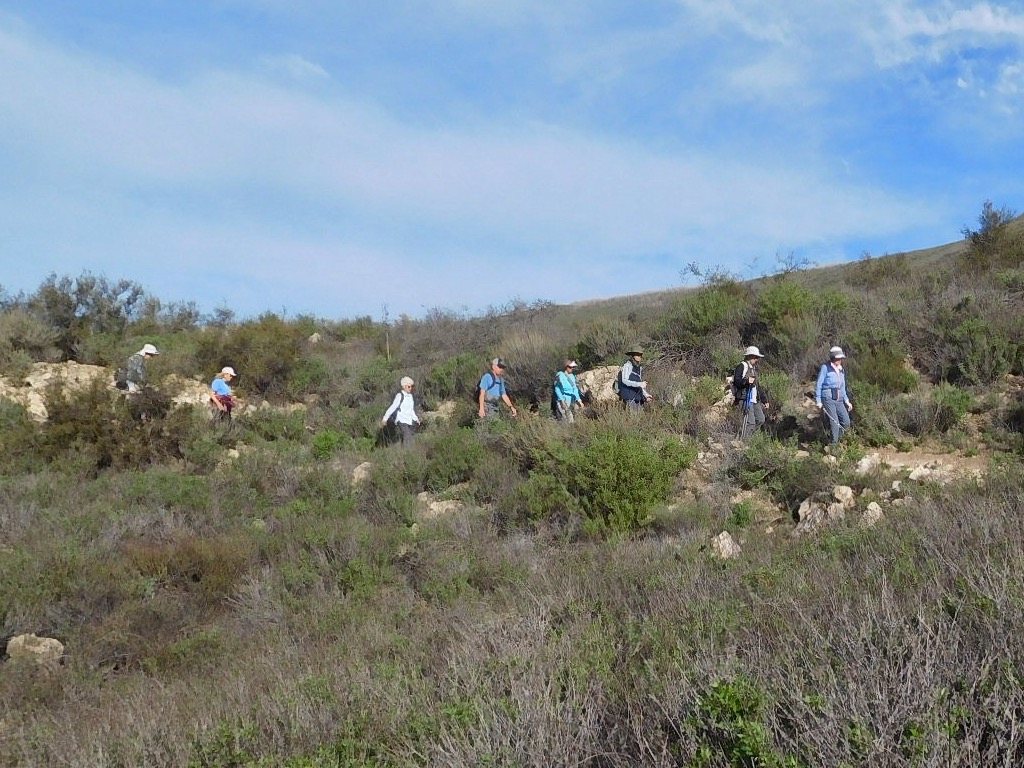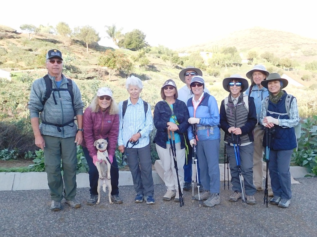 Ten hikers, 11 counting Sammy, met at the Long Canyon Trail parking lot in Wood Ranch on a bright, brisk morning. The Hike began by going west on the Woodridge Connector Trail that started off flat and straight for about 0.3 miles, then turned into a single-track trail, eventually crossing a paved road into Thousand Oaks. We connected with the Woodridge Loop trail where there were views of elegant houses and Conejo Valley off to the south, and Bard Reservoir to the north. The hike continued around a gated community at the end of Sunset Hills Blvd. until we started heading east into Long Canyon Open Space. We enjoyed different types of scenery and terrain, fresh air, birds and rocks and curiosities along the way, accented with good conversation. It was a fun 4.7 miles round-trip hike with around 660’ of elevation gain/loss when we arrived back to our vehicles at the Long Canyon Trail head.
