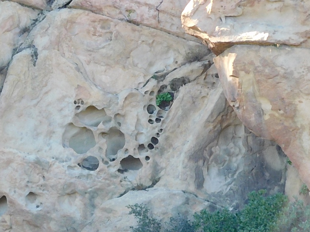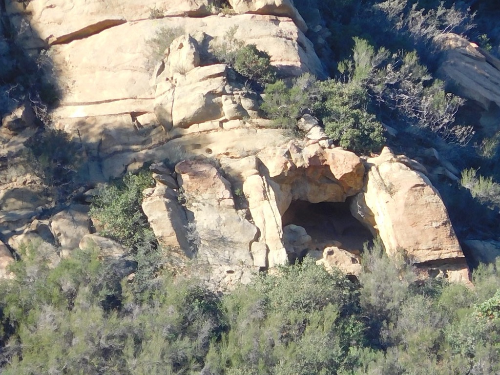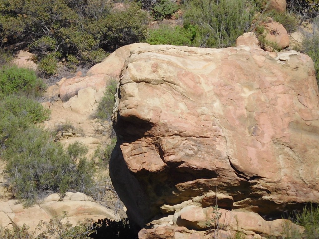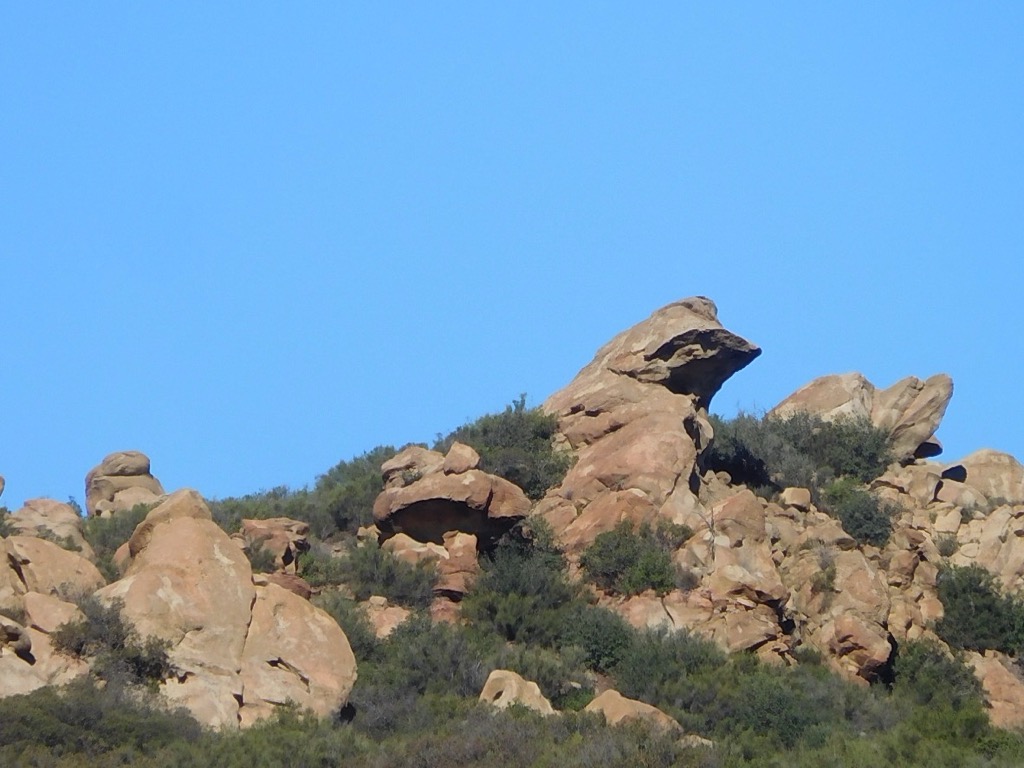 4 hikers met at 7:30 AM at the trailhead next to the paved parking area just outside the gated entrance to Hummingbird Ranch at the north end of Kuehner Drive in Simi Valley to hike up the Hummingbird Trail (and back). The weather was perfect, cool and overcast, as we began our 2.4-mile eastward climb to the Rocky Peak Fire Road. It wasn’t long before we were passing through (and on) a variety of imposing sandstone rock formations along the way including very large boulders and giant slabs of sandstone rock, many with small “caves.” We had the trail almost entirely to ourselves thanks to our early start and the fact that it was a weekday. About a mile into the hike there was an unmarked trail going north that we decided to take to see if we could find the swing Cave. We didn’t go far, unsure if it was the right trail so we turned around and got back on the main trail.