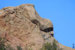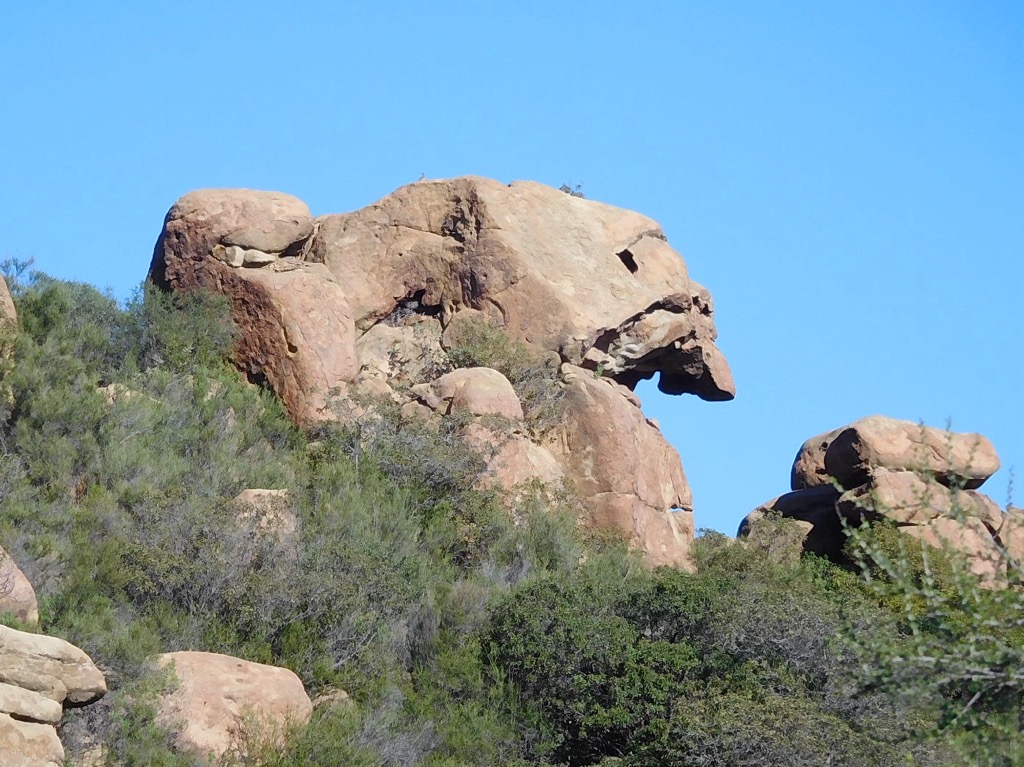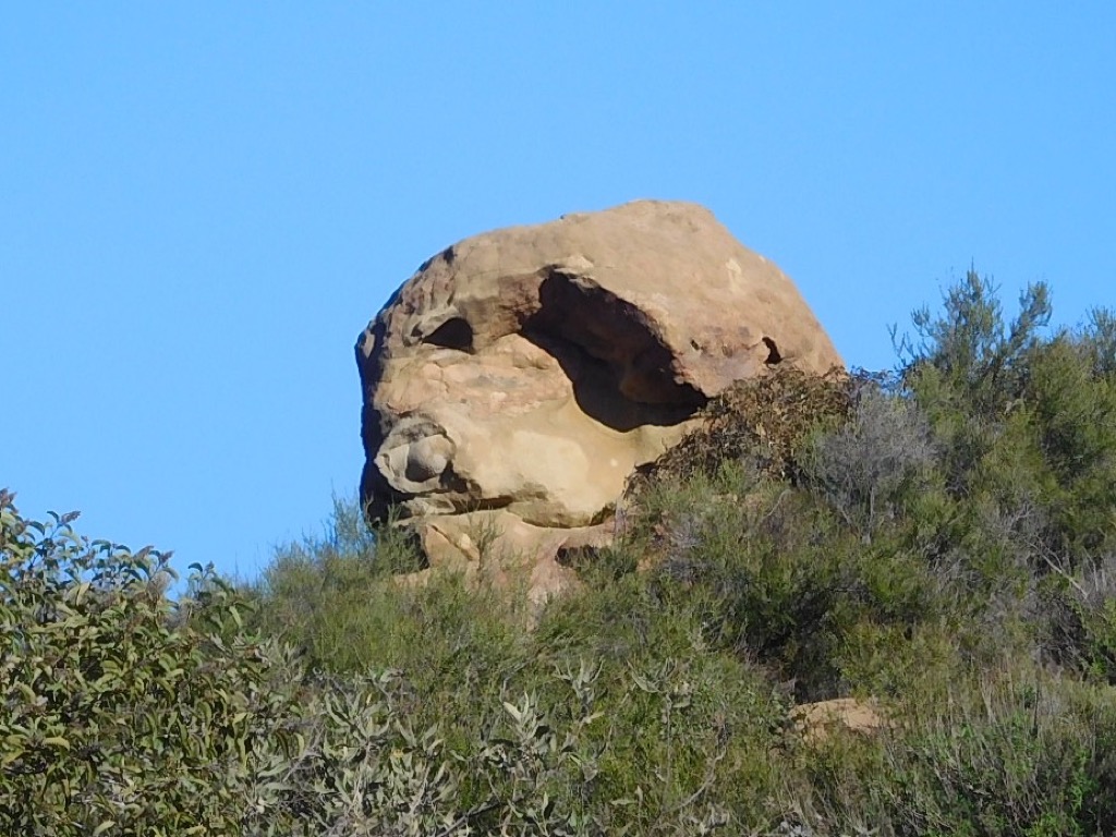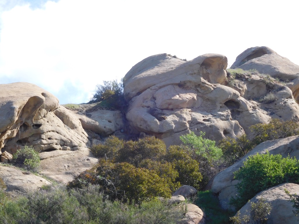 Three hikers met at the lower parking lot in Sage Ranch Park in the Simi Hills on a beautiful, chilly spring morning. The 625-acre park is located just north of the Santa Susana Field Laboratory (SSFL) (aka Rocketdyne/Boeing) at an elevation of 2,000’. The park is full of world-class sandstone rock formations, great for visualizing animal shapes and faces. To the north there is a side trail that will take you to a nice overlook that usually provides a sweeping view of Simi Valley. We continued hiking along the main Loop Trail enjoying, a lush green landscape and stopping to climb Sandstone Ridge (aka “Sugarloaf”). Eventually we reached the “detour” where the environmental cleanup effort is continuing. Turning onto the “detour” trail, leading us northward through the center of the ranch, the hike offered us more unique terrain.